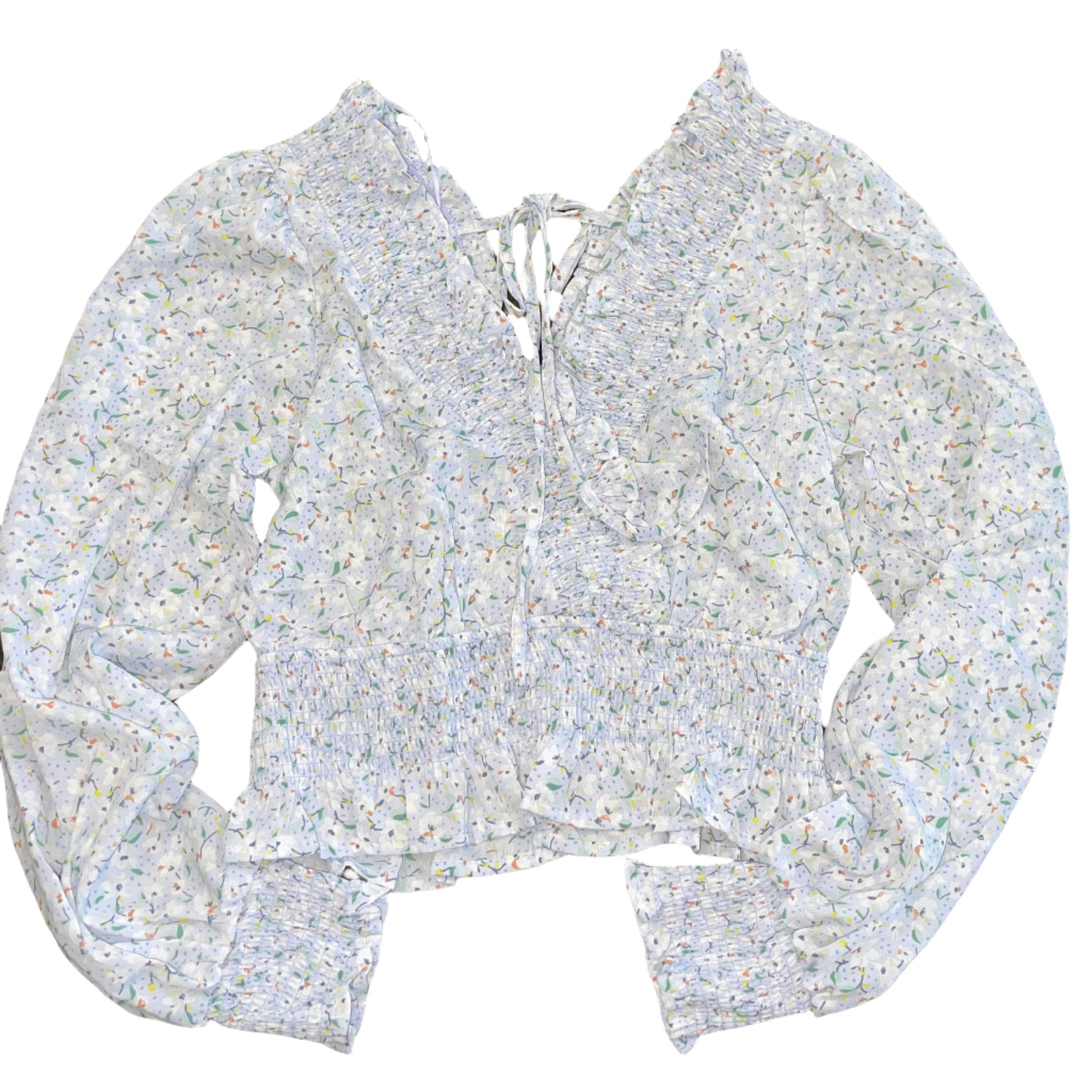 The light blue smocked top features an allover floral print with a v-neckline, smocking around the waist and a back tie.