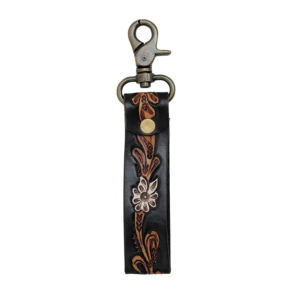 This intricate key fob has a very striking design. White flower printed onto a shiny black background instantly attracts attention and stands out unique.