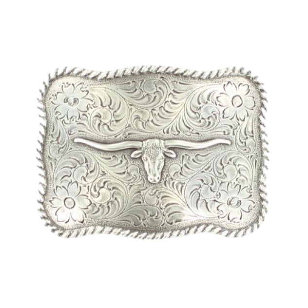 Scalloped rectangular Nocona buckle by M&F Western Products trimmed with rope edging. Floral background etched into the silver with longhorn head in center. Boxed for easy gift giving for that special cowboy. Rectangle buckle measures approx 2-3/4 x 3-3/4.