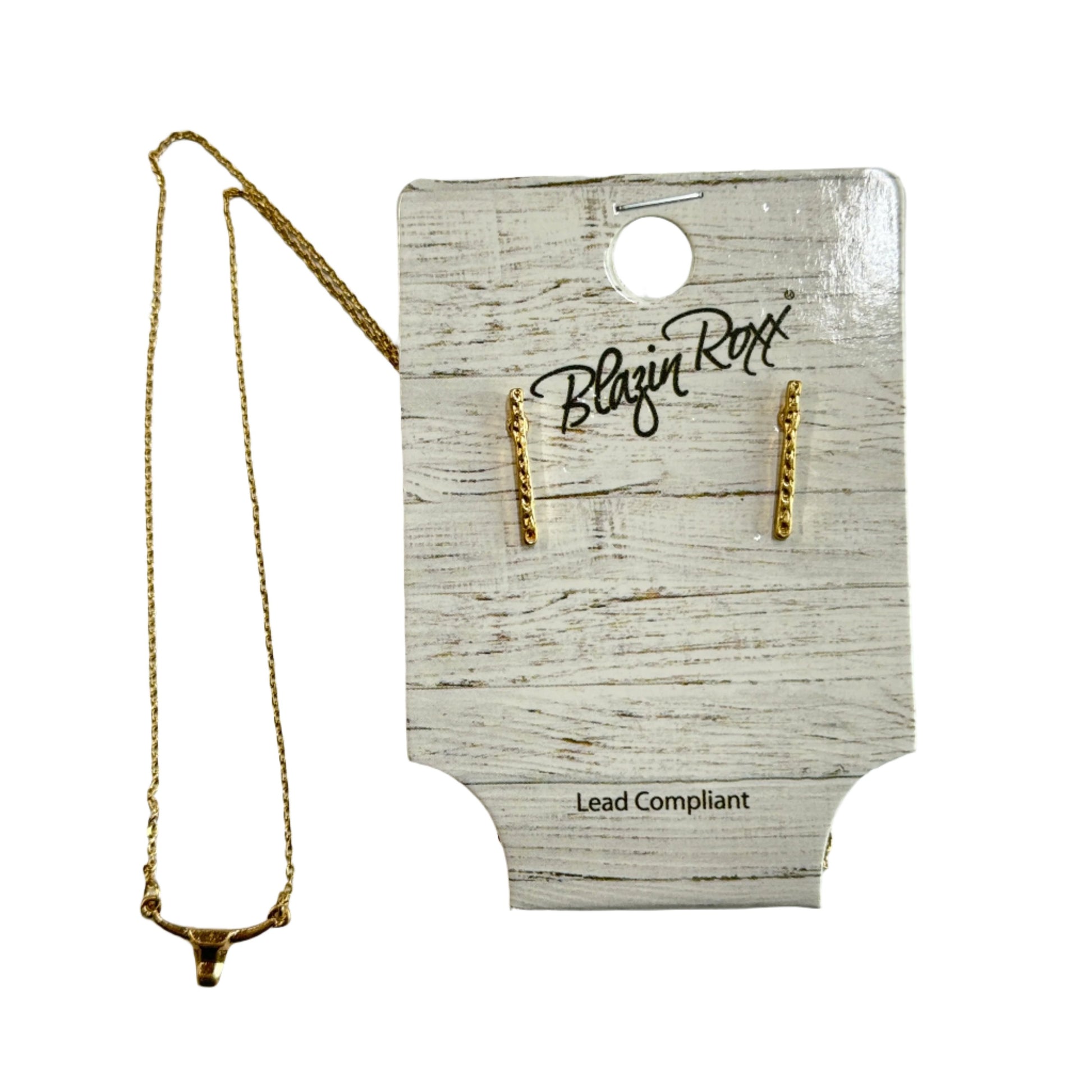 Simple, minimalist style Blazin Roxx necklace with a thin burnished gold chain with a small, longhorn head pendant. The earrings are a gold bar drop style.
