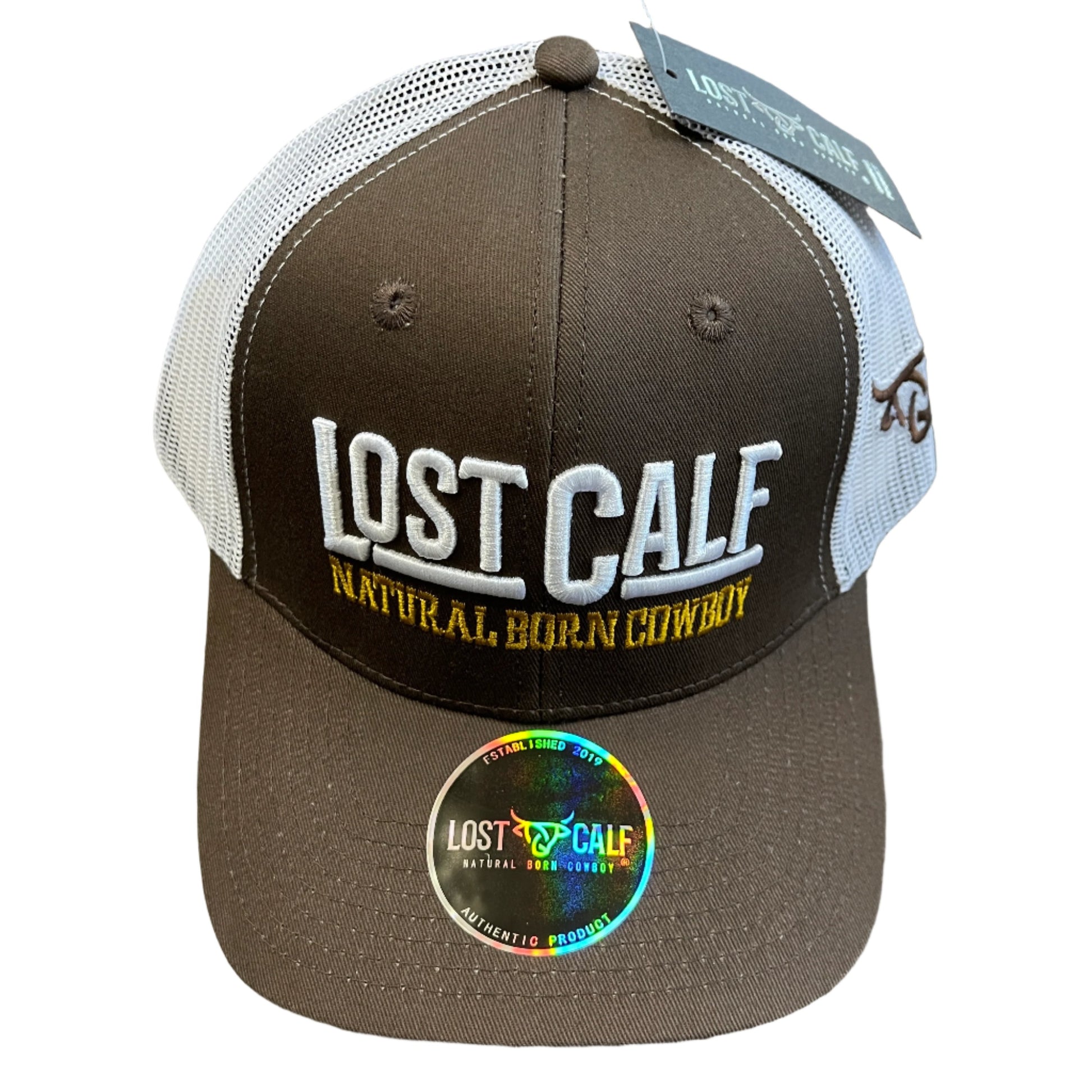 Baseball cap with Lost Calf embroidered on front, and Lost Calf logo stitched on left side. Richardson Trucker Snap back - one size fits all.