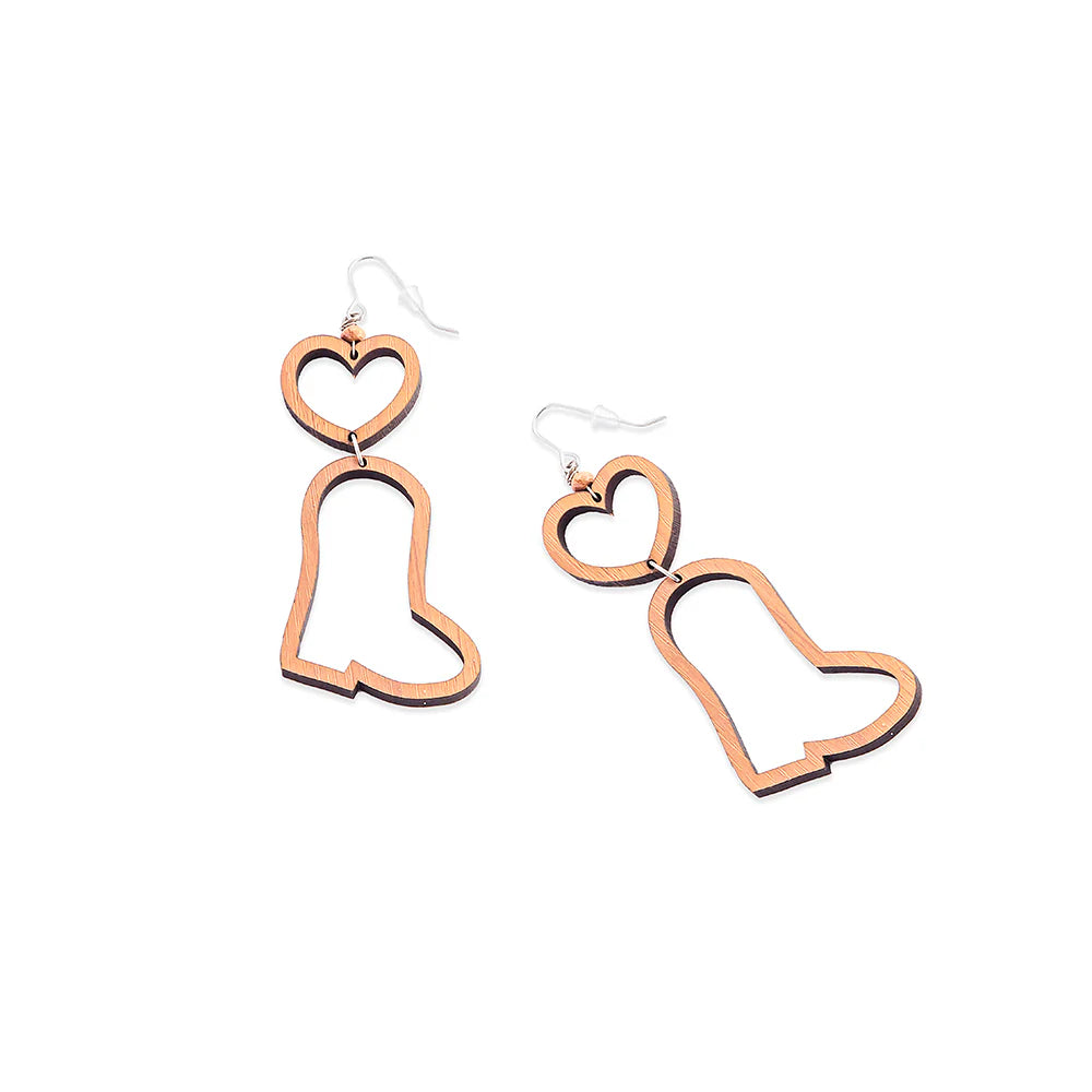 Double the love with our statement heart-boot earrings in natural mango wood. These lightweight wooden showstoppers combine romantic hearts with Western silhouettes for a uniquely charming look that captures both sweetness and spirit.