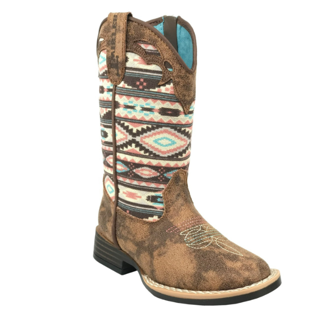These Twister boots by M&F Western Products will be what your little cowpoke grabs every day to wear whether she's going to the barn or just outside to play. These great boots feature a distressed brown vamp with pink, ivory and turquoise toe bug. Comfortable and dry with moisture management lining. Easy on/off with side zipper.