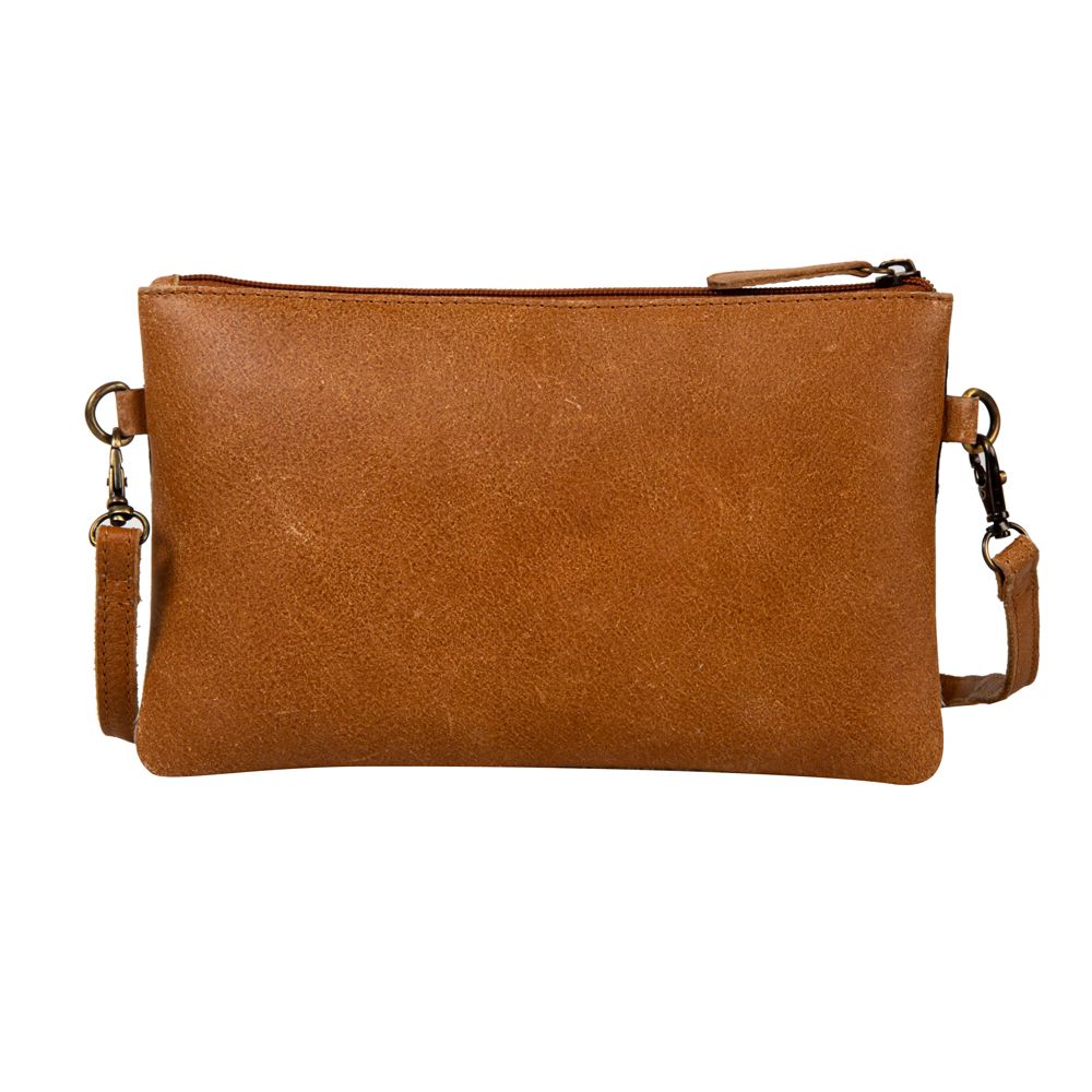 This alluring bag features a front of hair-on hide with a beautiful accent panel of detailed, hand-tooled leather in a timeless floral pattern. The reverse is a warm deep caramel leather. Zipper-close top, and matching leather adjustable, removable shoulder strap. A gorgeous bag for any occasion!