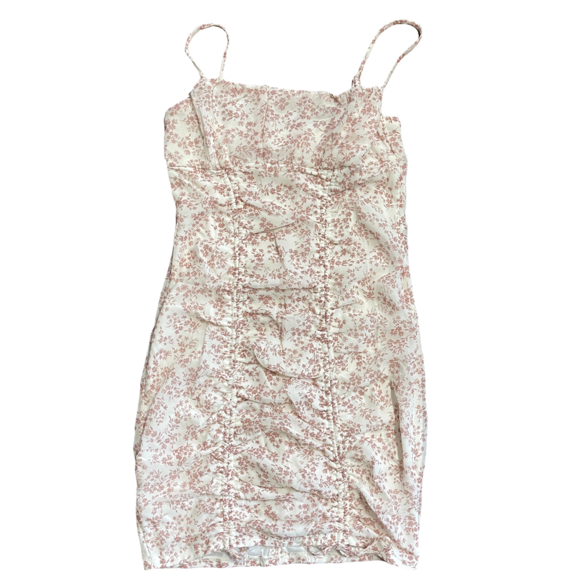 The mauve mini dress features a front ruched detail with adjustable thin straps.