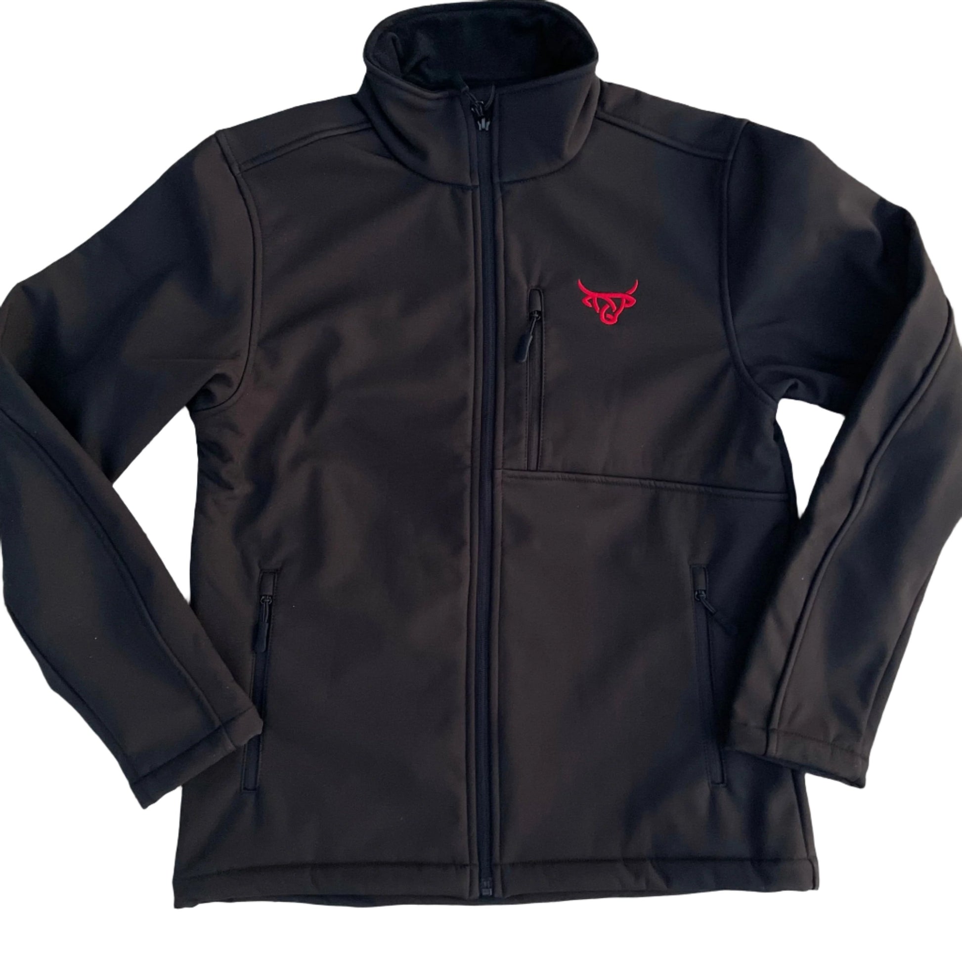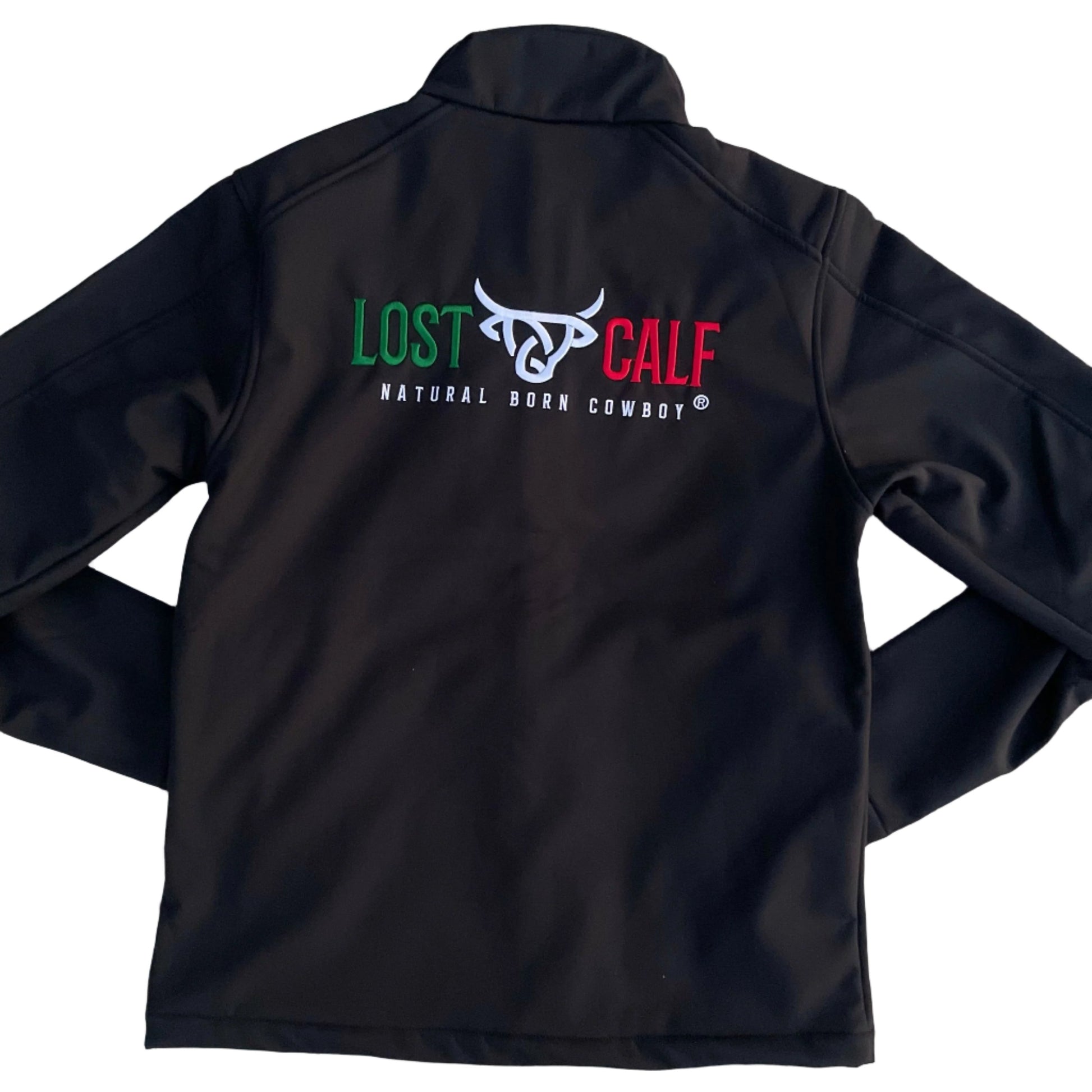 The Lost Calf Mexicalf softshell jacket features a red Lost Calf embroidered logo on the left chest and a Lost Calf embroidered logo on the back in green, white, and red. This jacket is wind-resistant, water-resistant, and offers a 4-way stretch. The Lost Calf softshell jacket features front zippered pockets and a pocket on the chest.