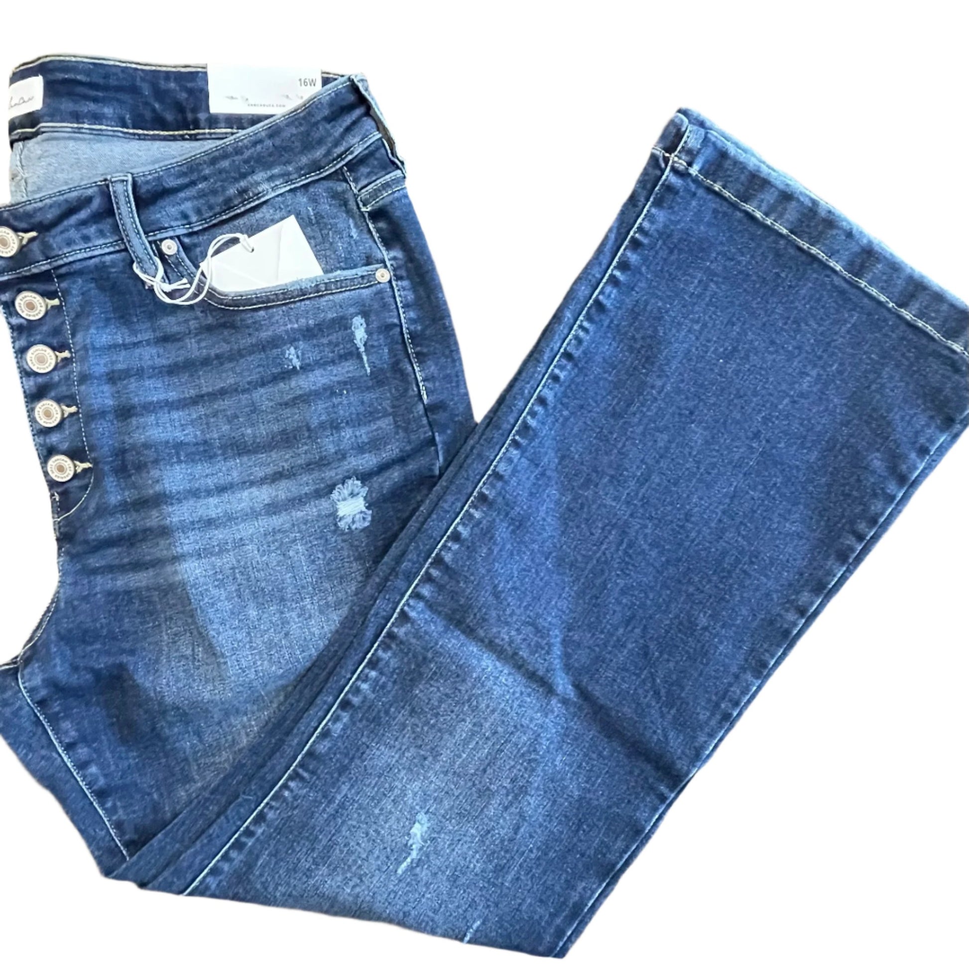 The Saylor Mid Rise Jeans come in a petite fit with a flare cut complete with light distress and a gently faded wash. Sits right at the natural waistline as it gently tapers down the thigh and begins to flare out at the calf. Made with super-soft stretch denim that's smooth and flexible. Features a classic five-pocket design and four-button front closure.re.