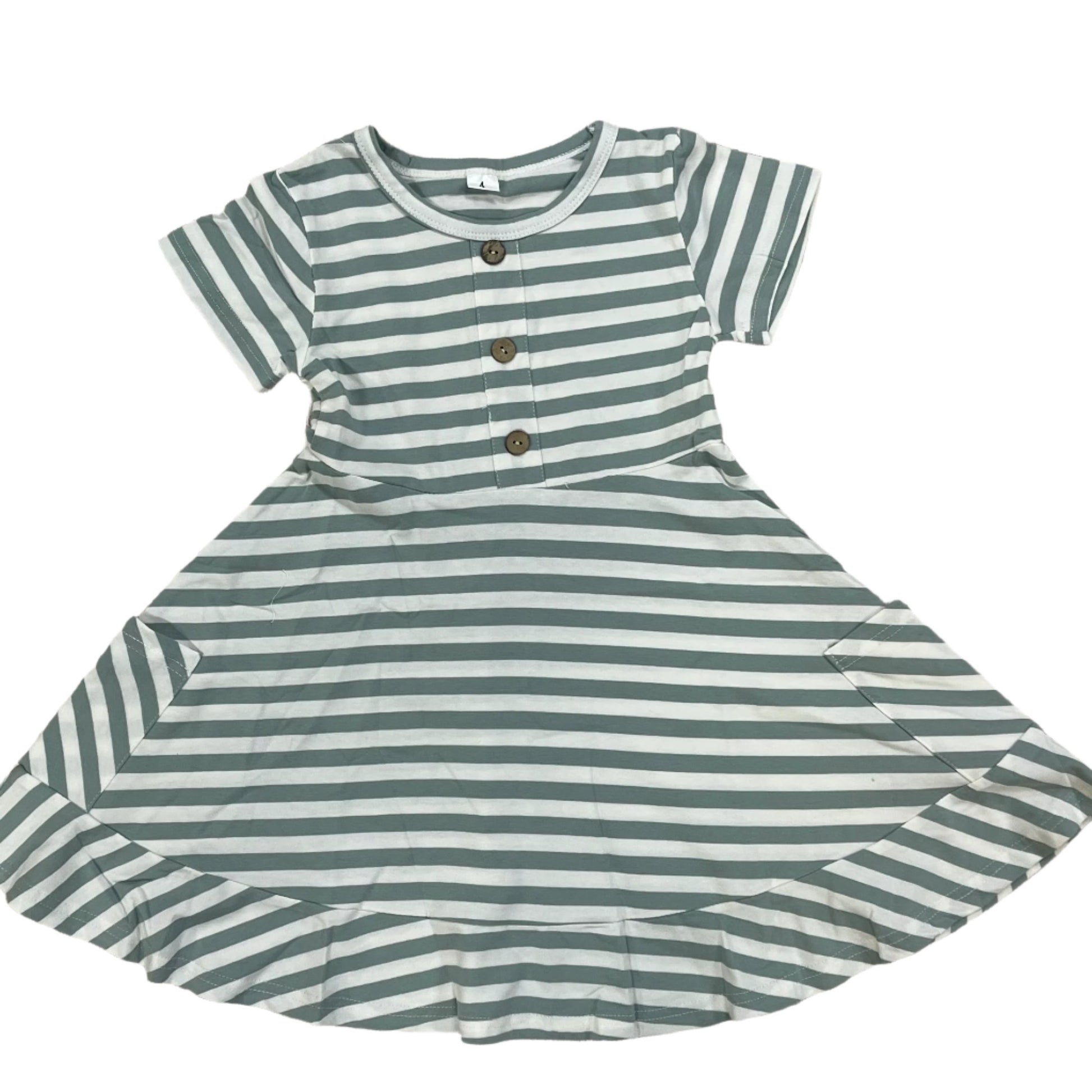 The Mint Twirl Dress is perfect for every little girl, it features 3 brown wooden buttons down the front in a mint and off-white color.