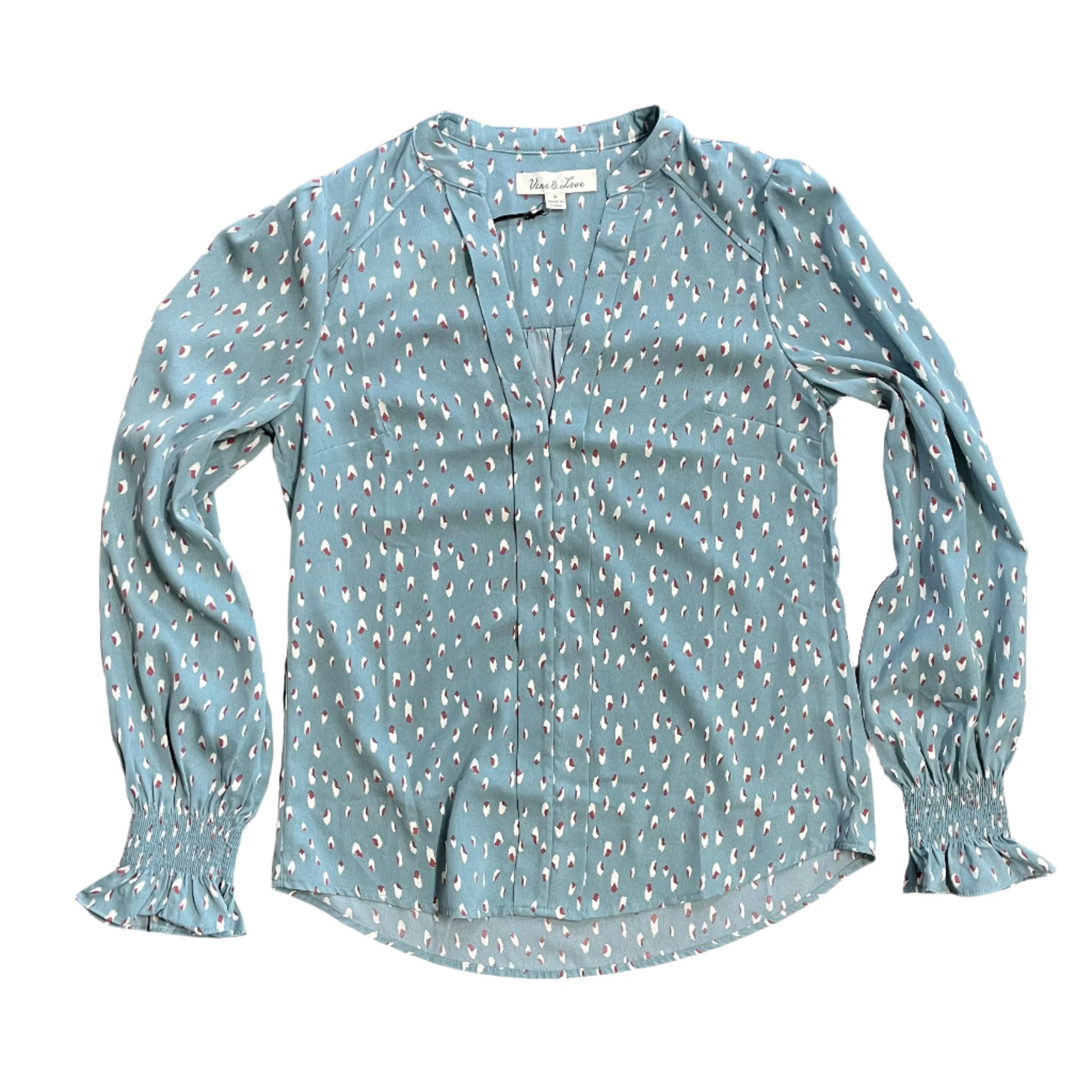 The Misty Blue top features long sleeves with smocking and a V-neck.