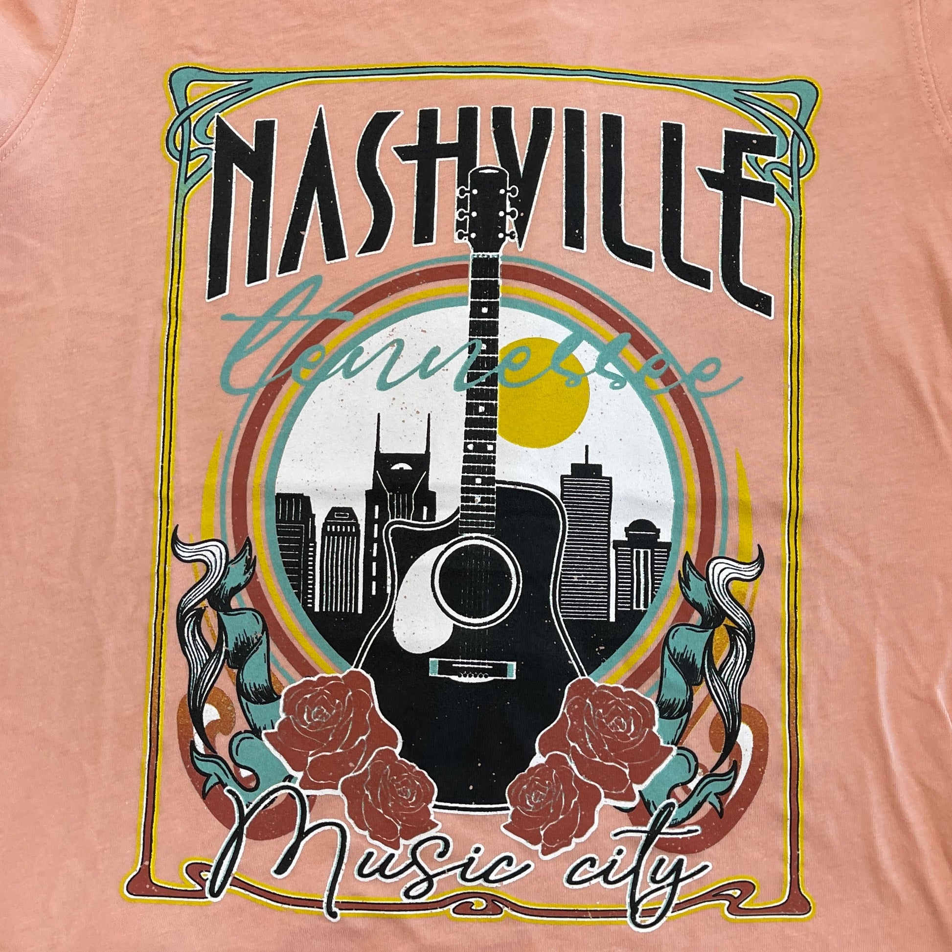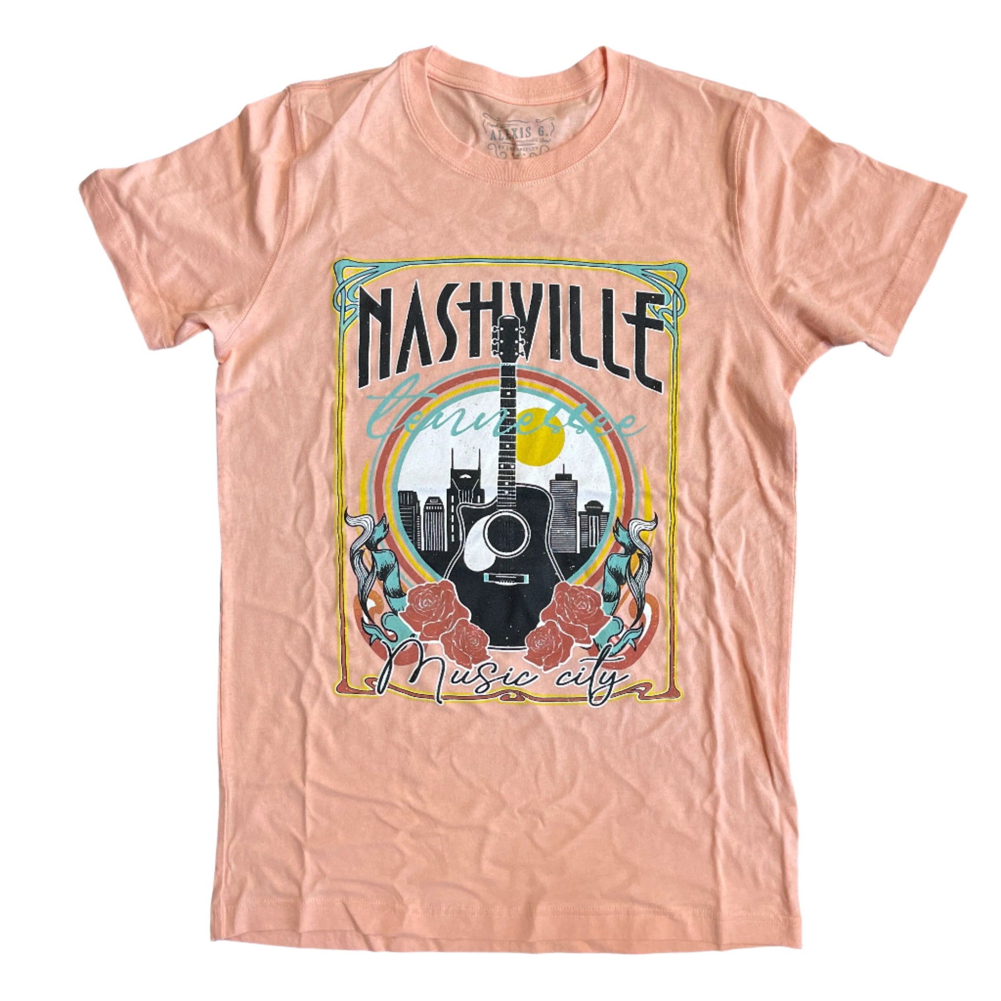 The short sleeve, peach pink t-shirt features a Nashville Music City graphic on the chest.