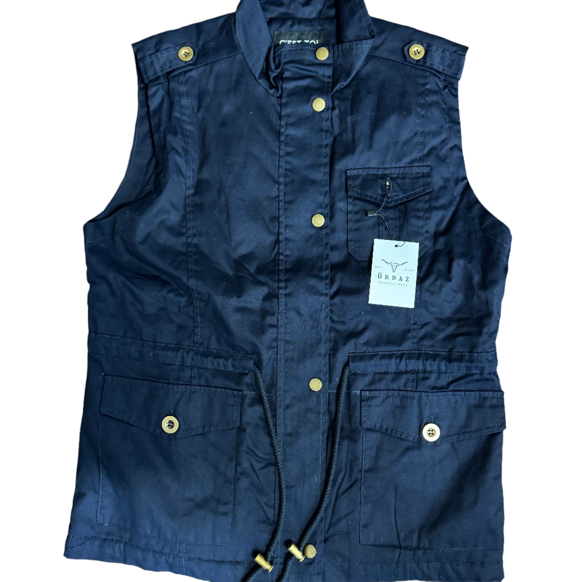 The navy vest is faux fur lined with zip and wind flap at the front with snap fasteners.