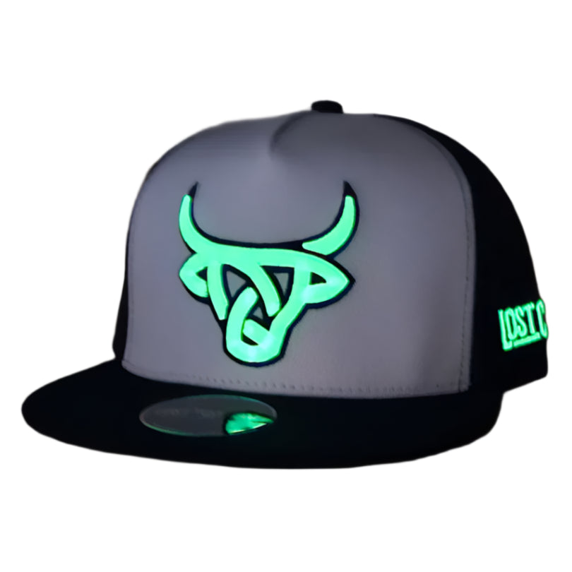 Glow in the dark baseball cap with Lost Calf logo on front, Lost Calf stitched on left side. Snap back - one size fits all.