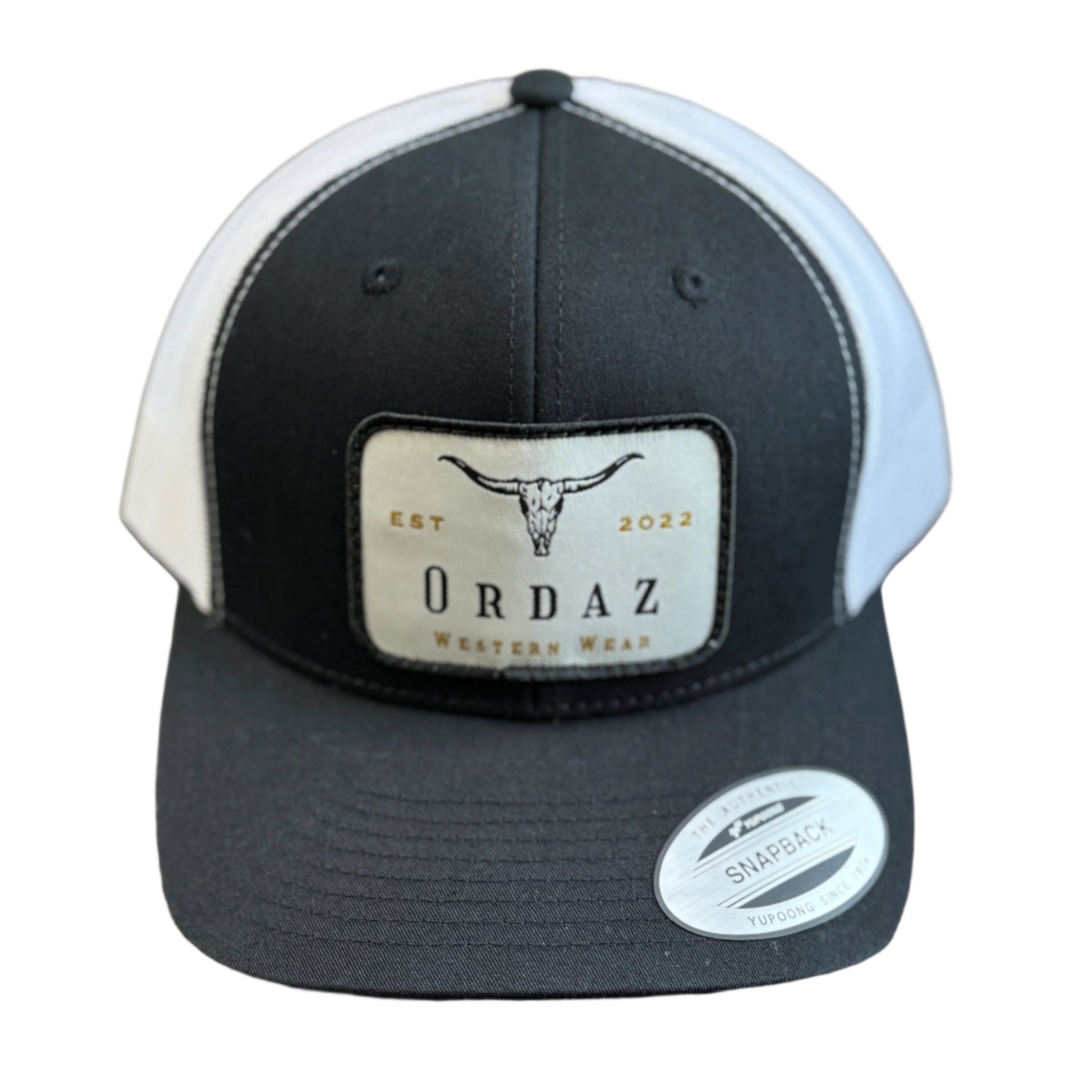 The Ordaz Western Wear snapback features a hand stitched woven patch with the Ordaz Western Wear logo. This cap features a curved brim and an adjustable snap closure. One size fits most.