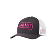 The front panel is solid black fabric with “Ariat International” embroidered in hot pink on the patch. Black bill with hot pink stitching. White mesh back with hook and loop closure.