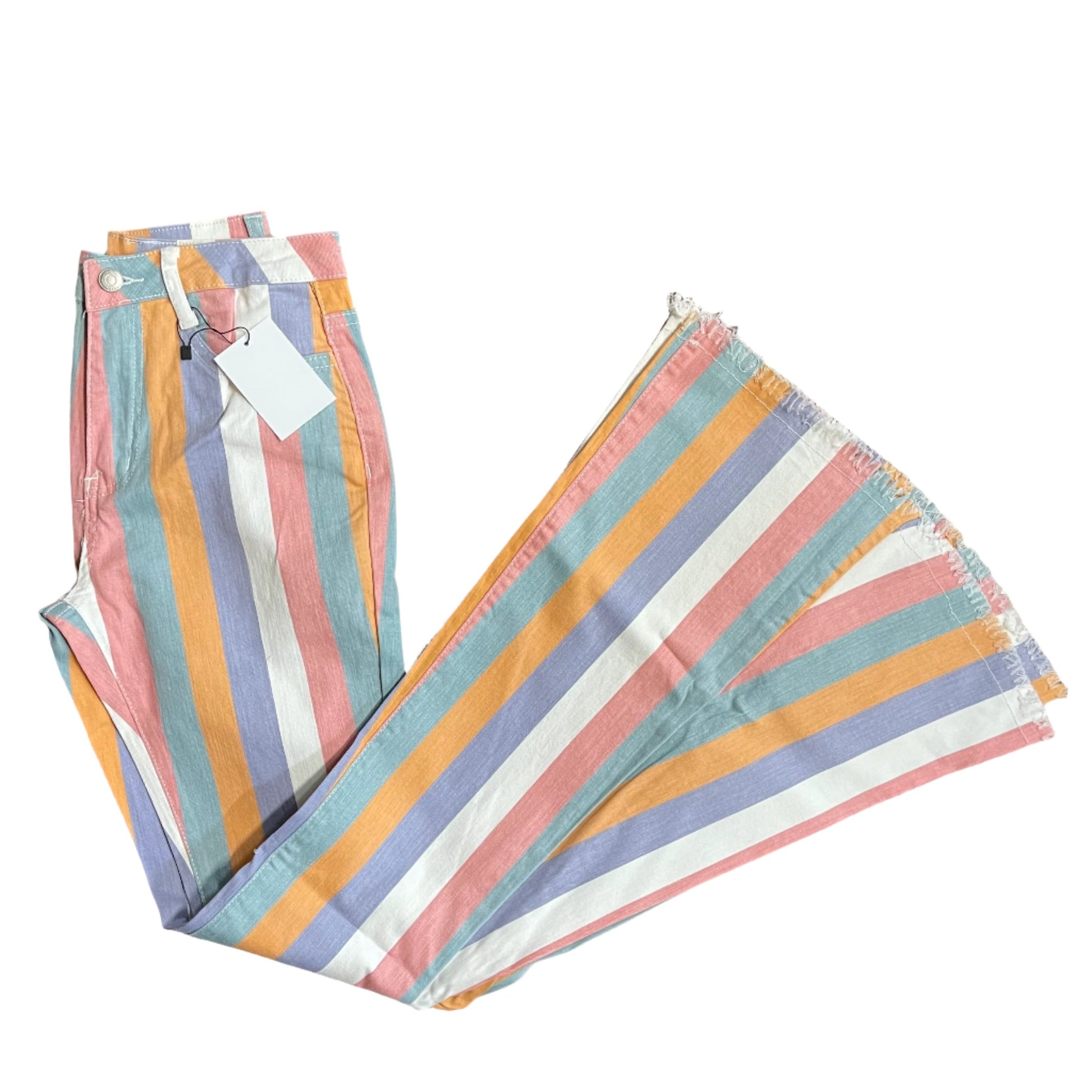 The Peach multi stripe jeans are super flared, stretchy and feature distressed hems.