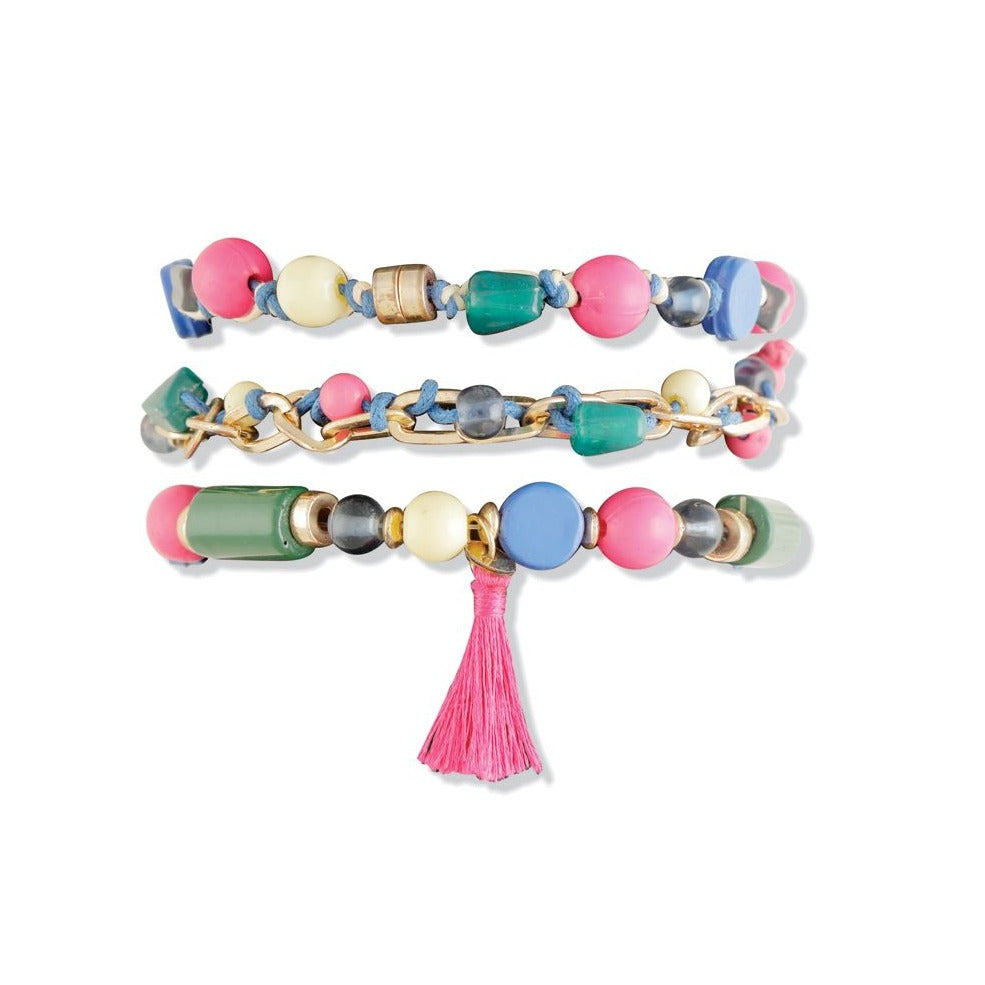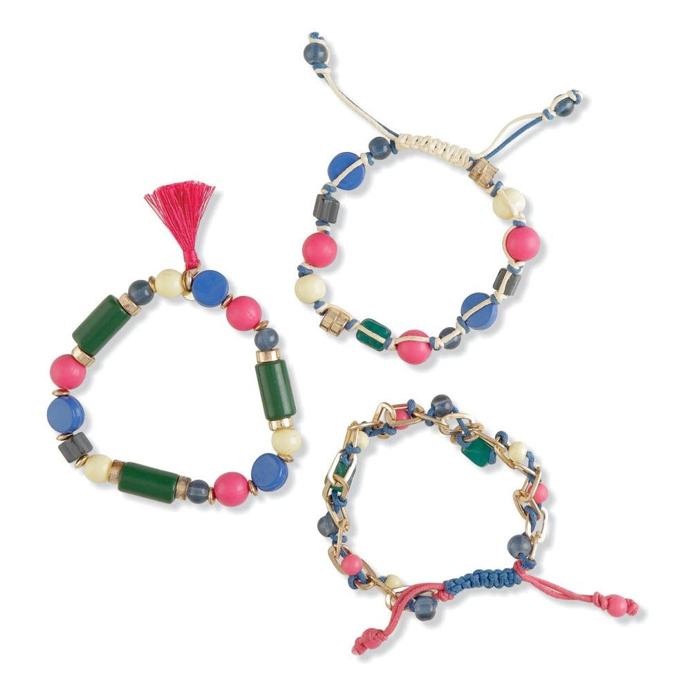 This bracelet really pops up with its bright shades of pink, blue and black.