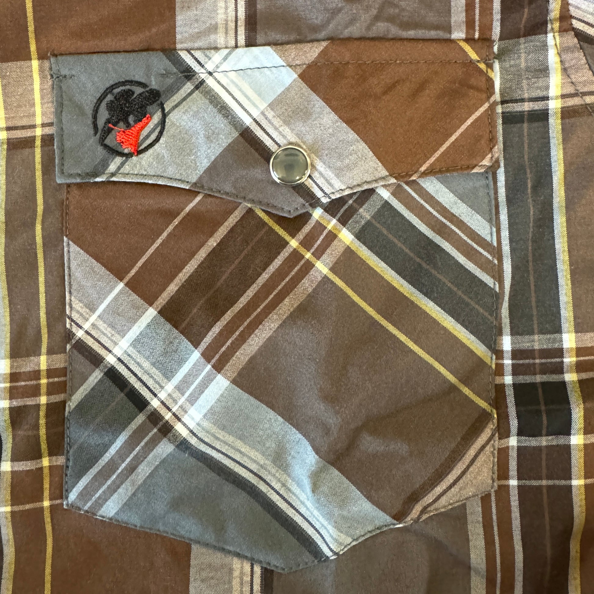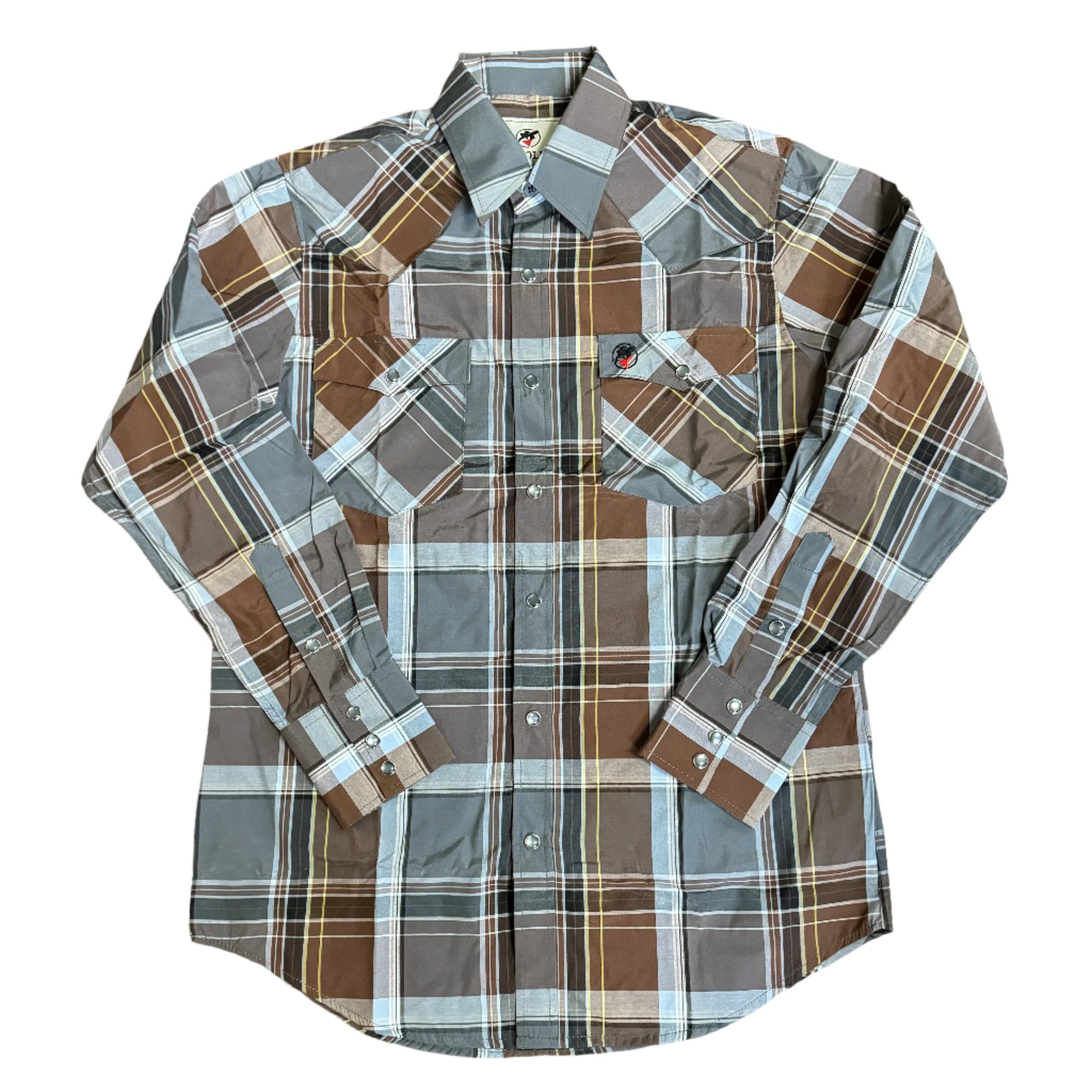 The grey and brown plaid button down, long sleeve shirt features a snap button closure with western pockets.