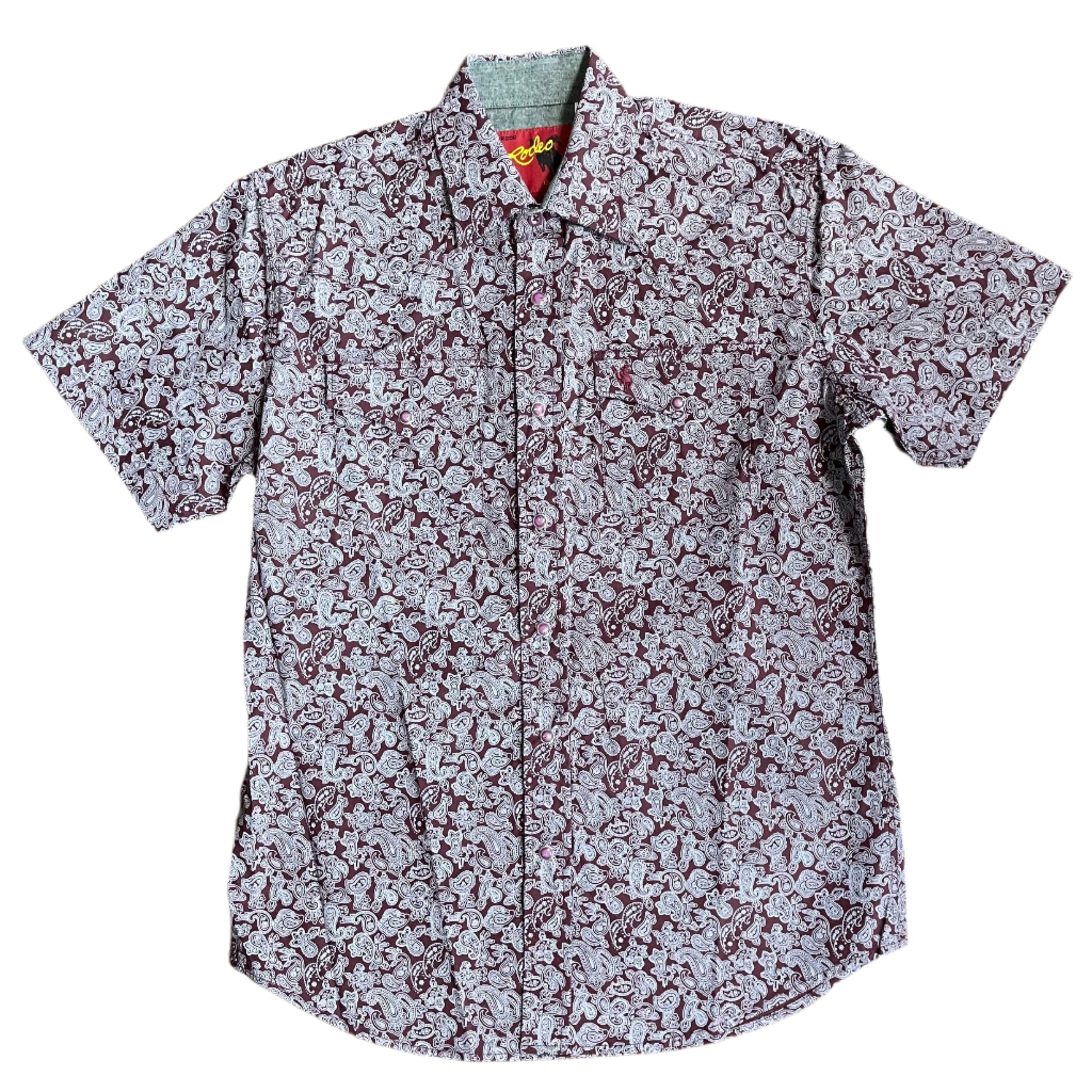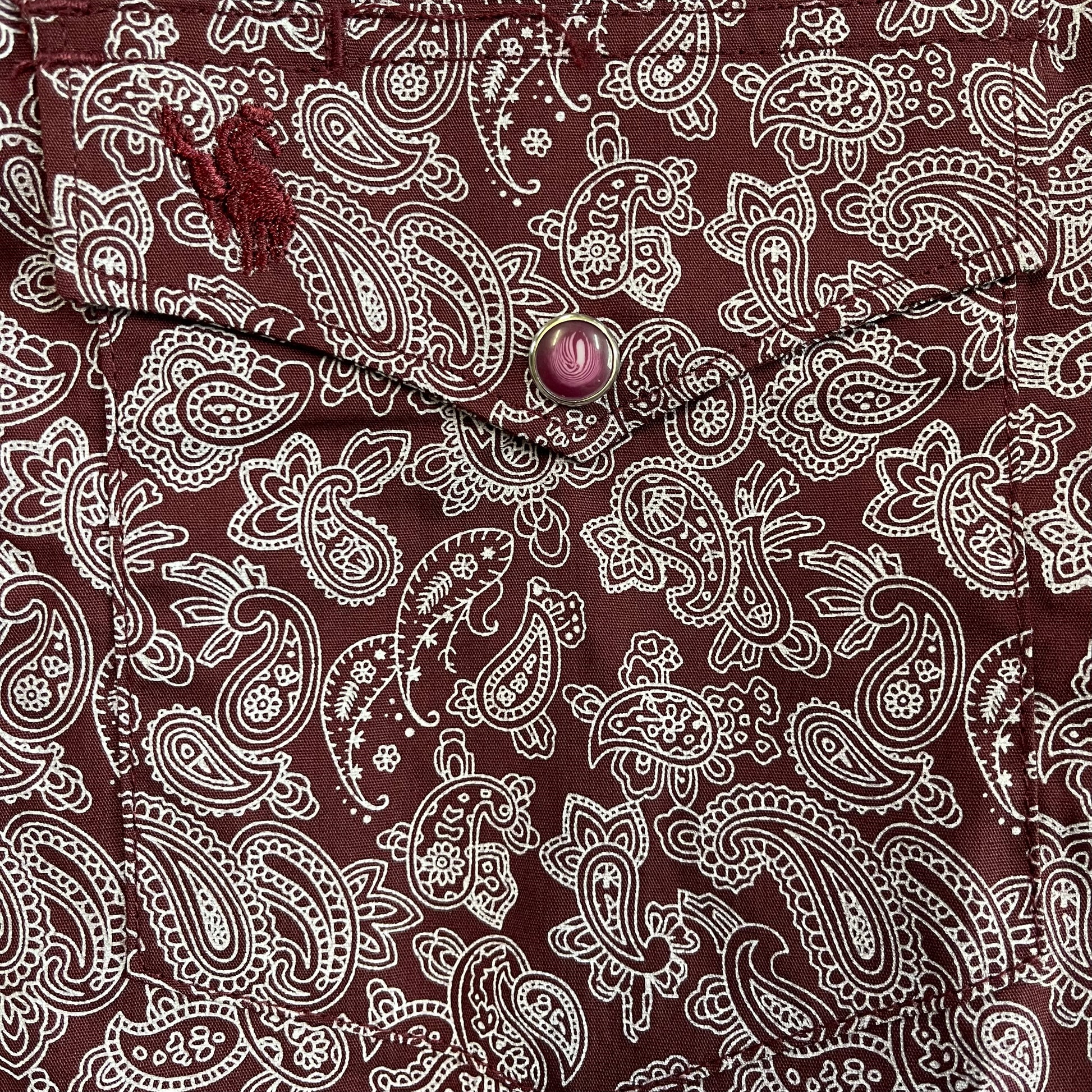 The plum and white paisley print button down from Rodeo Clothing Co. comes in short sleeve with snap button closure. It features a western style print and is made of 100% woven cotton.