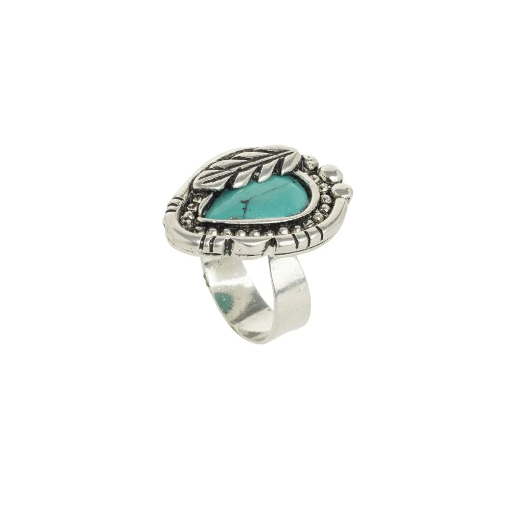 A Southwest classic! This elegant silver ring features a captivating lab-created turquoise stone as its centerpiece. Enhancing its charm is a delicate silver feather accent gracefully placed to the side. It's an ideal piece for those who appreciate unique, nature-inspired designs with a stylish edge.