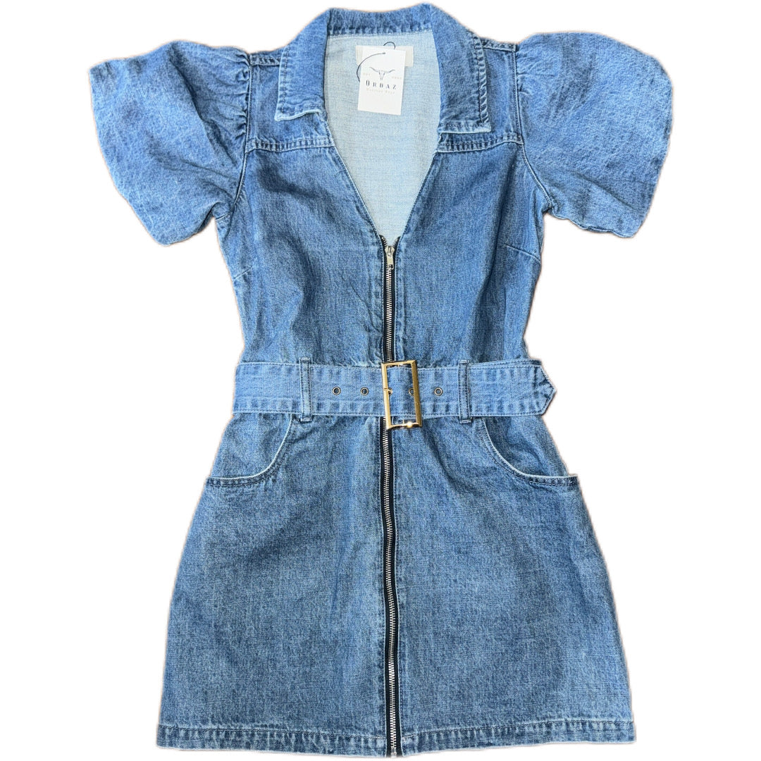 Puff Sleeve Denim Belted Mini Dress