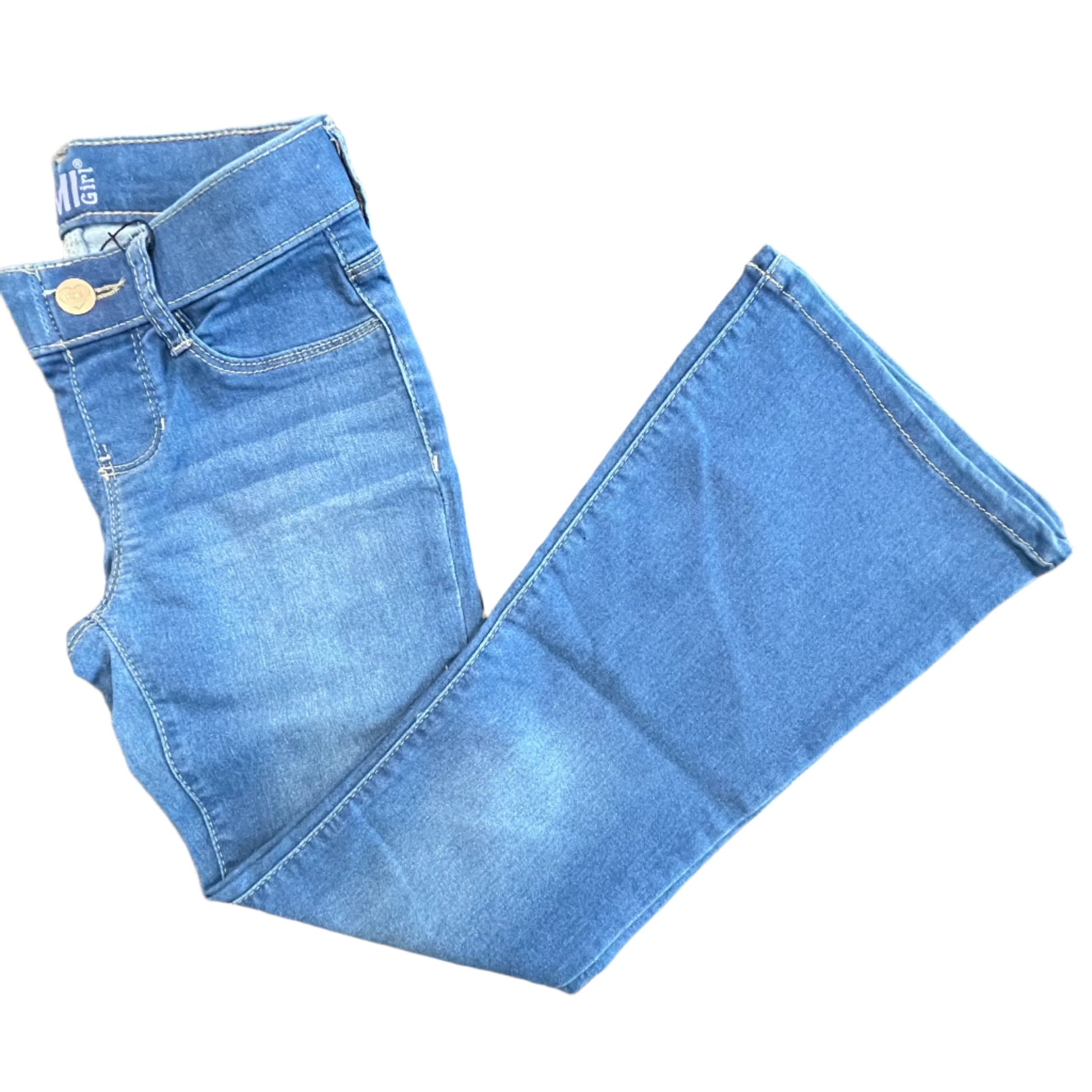 The YMI girl's pull-on flare blue jeans feature faux front pockets, faux single-button closure and functional back pockets with belt loops.