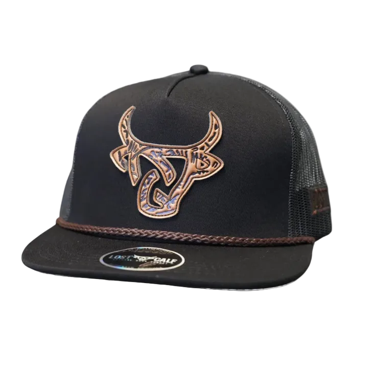 Baseball cap with Lost Calf Leather logo on front in Black , Lost Calf stitched on left side. Snap back - one size fits all.