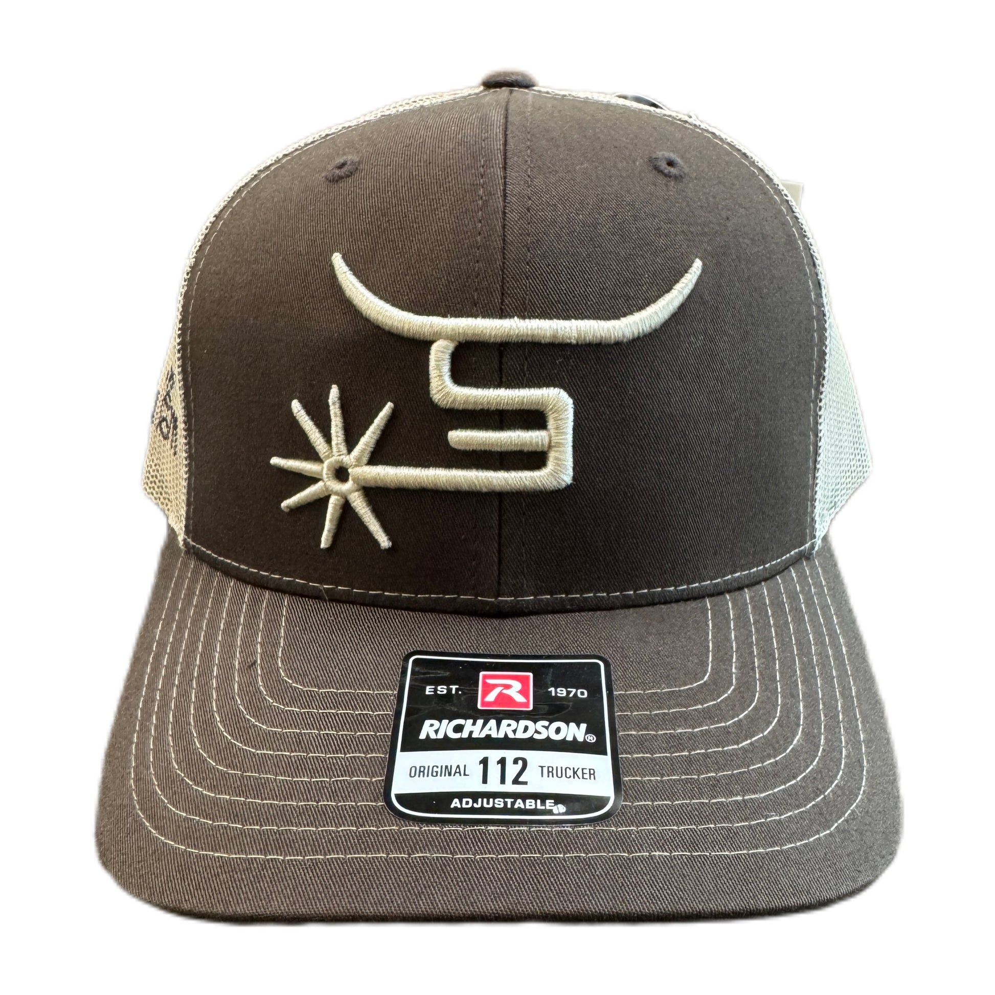 The Spin 'Em Rawhide cap features a beige Spin 'Em logo on a brown snapback.
