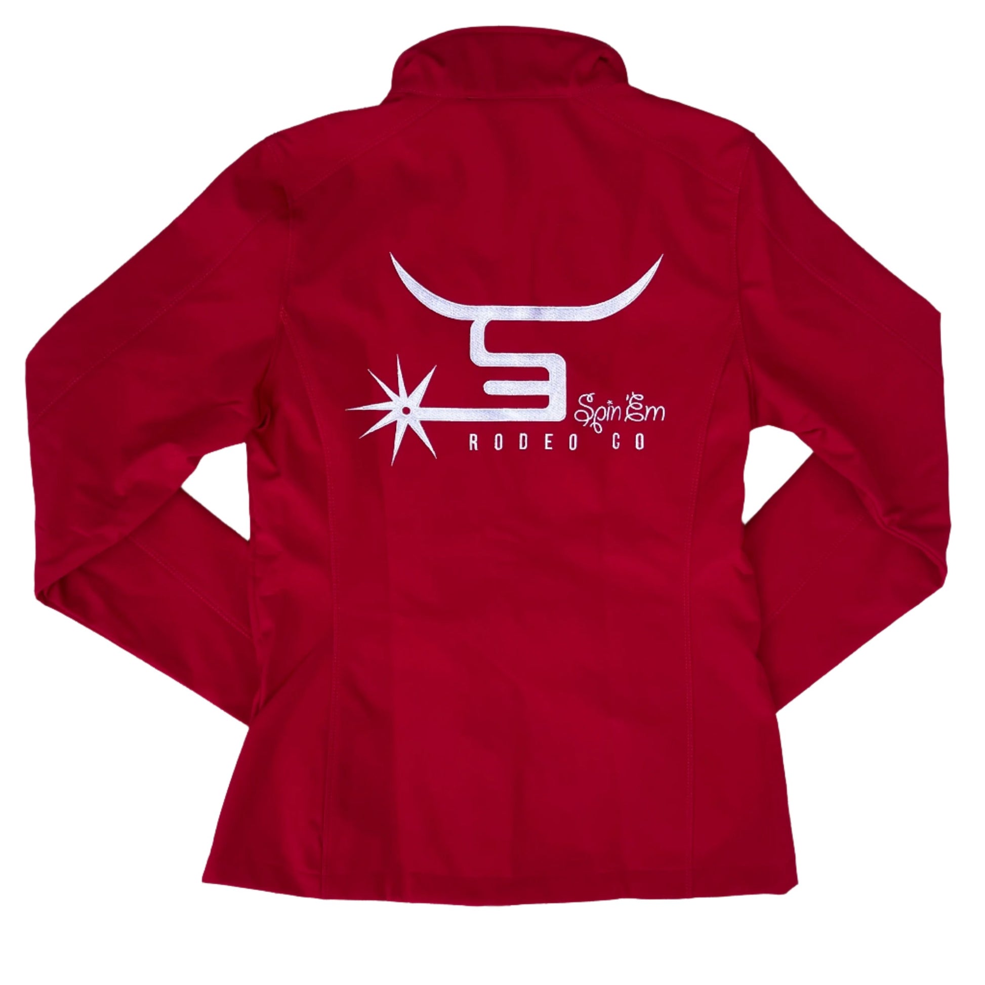 The Red with white logo softshell jacket from Spin Em features front zippered pockets, microfleece interior and is water resistant.