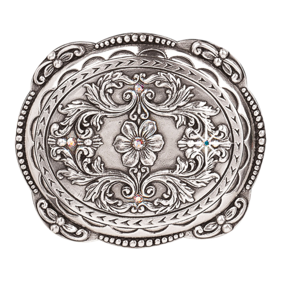 This silver buckle is simple elegance. It features beautiful scrolling with a center flower. Measures 2-3/4 x 3-1/4.