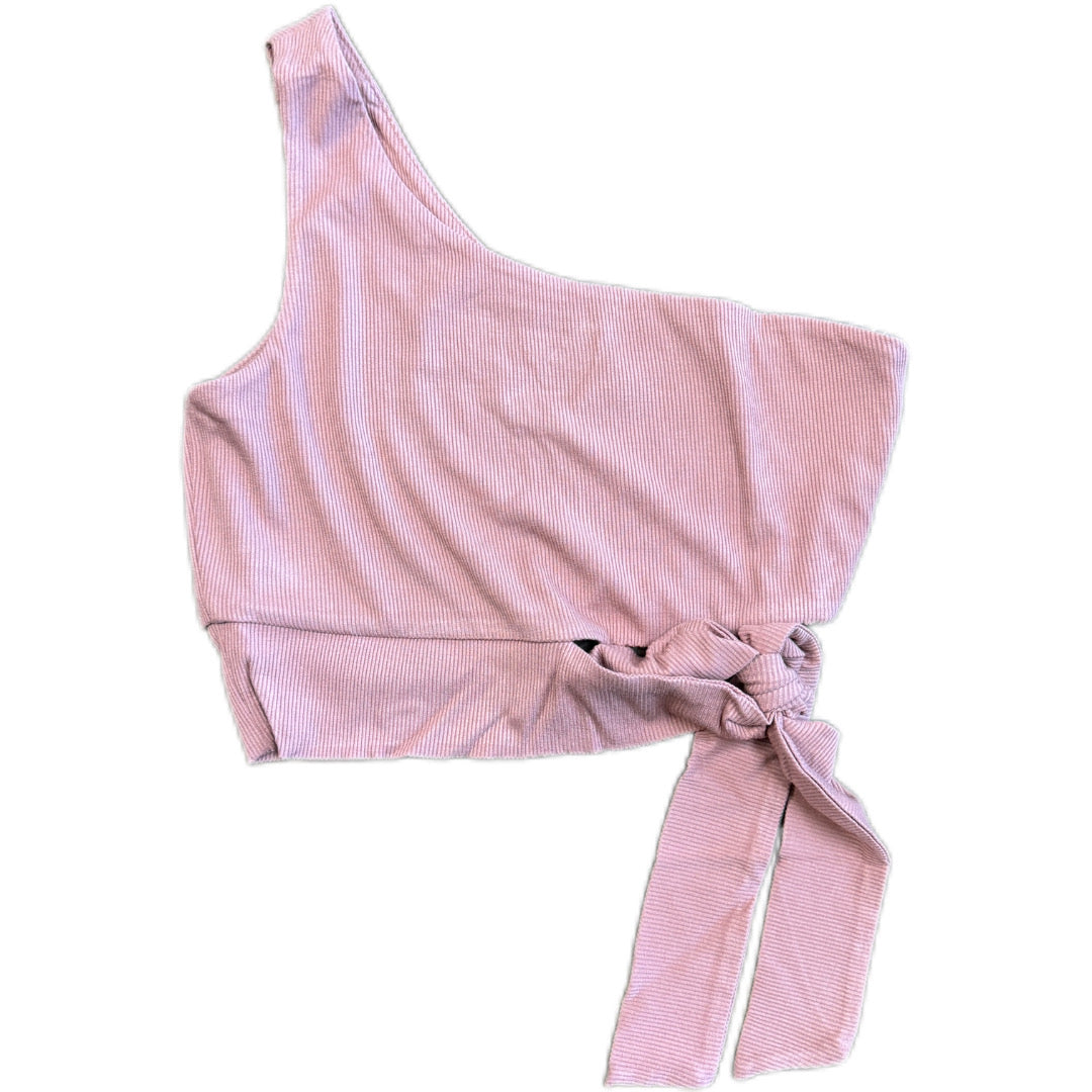 A ribbed knit top featuring cropped, stretch fabric, asymmetric one shoulder, and cut out side with tie.