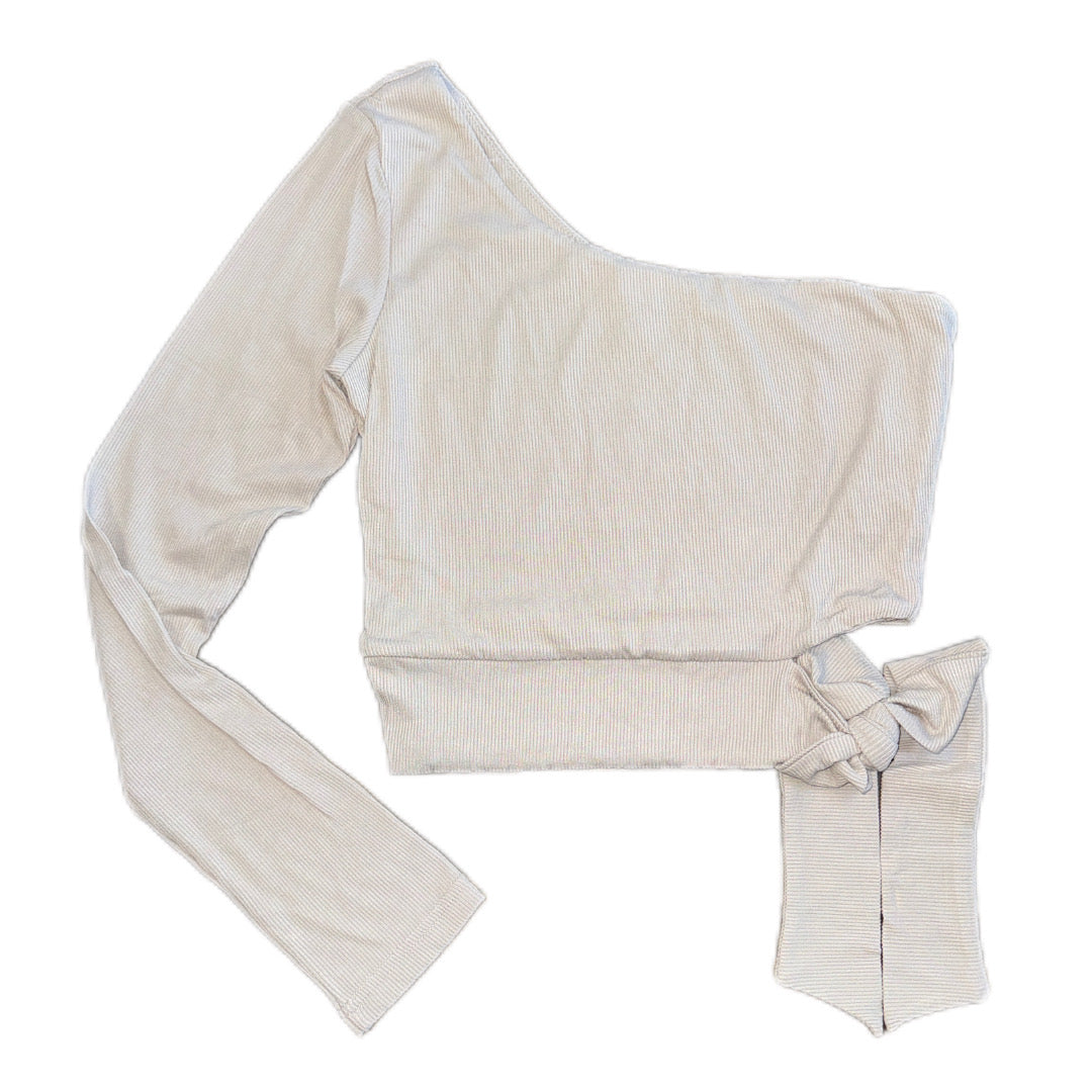 A ribbed knit top featuring cropped, stretch fabric, long sleeves, asymmetric one shoulder, and cut outside with tie.