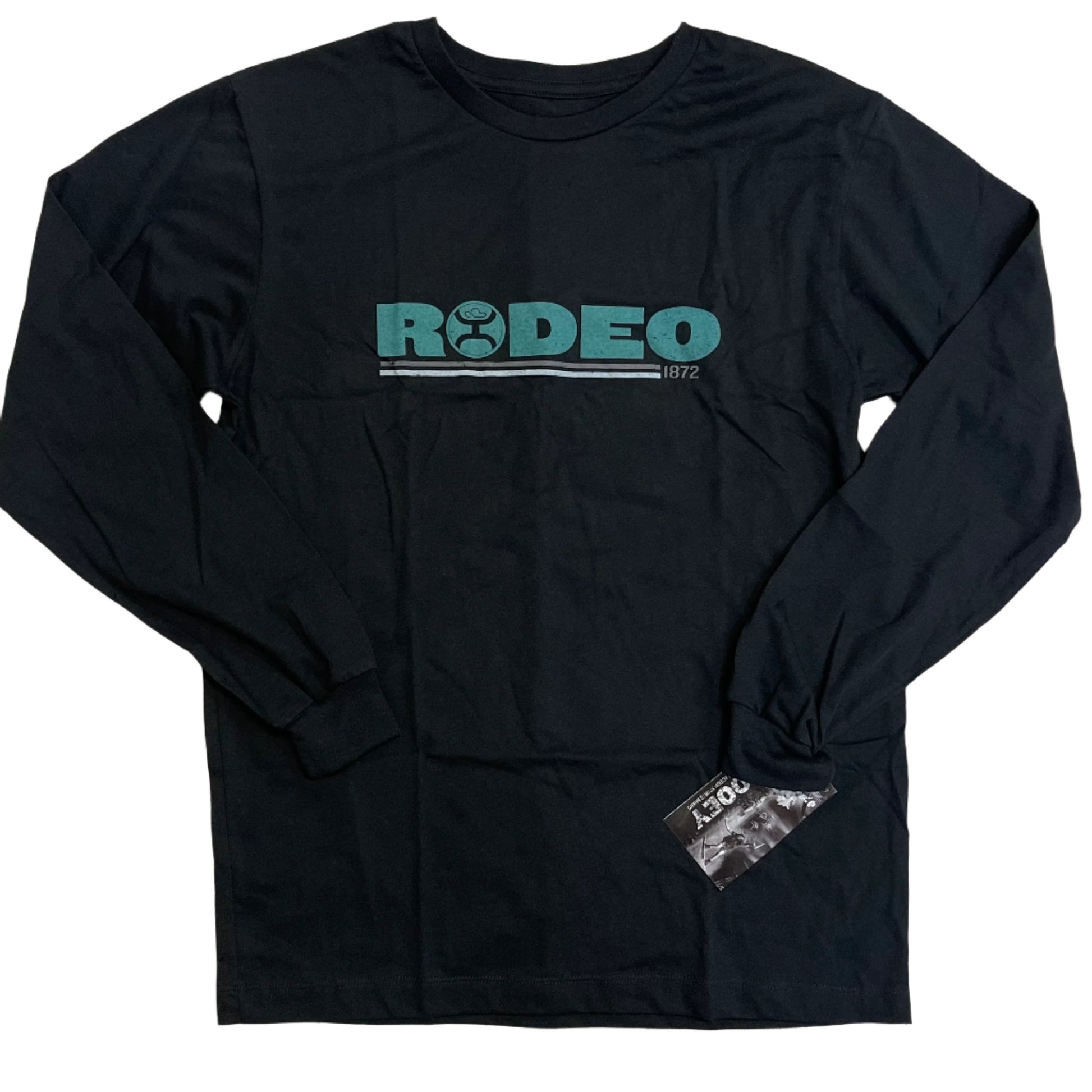 The Hooey long sleeve features a teal Rodeo design on a black long sleeve t-shirt.