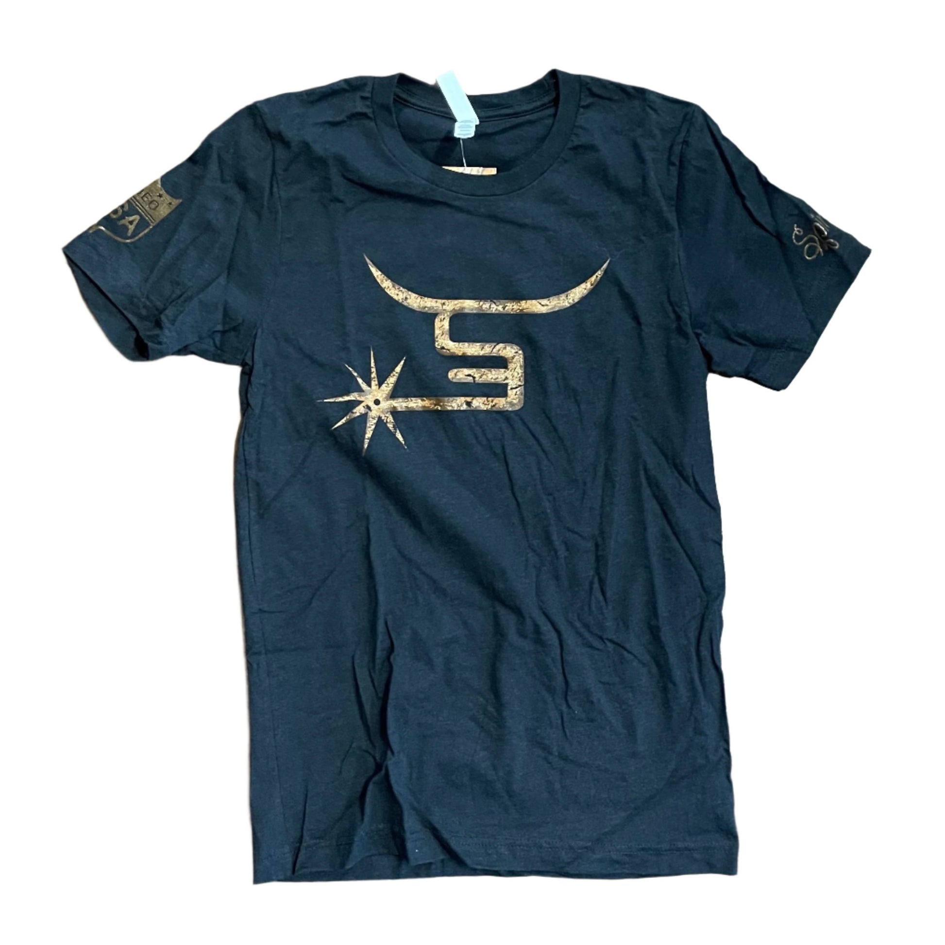The Spin Em Rodeo Co. T-shirt features the Spin Em logo in Rust with a design on each sleeve.