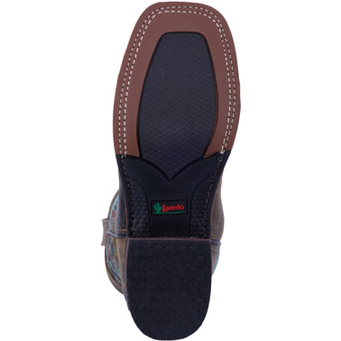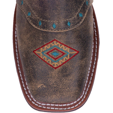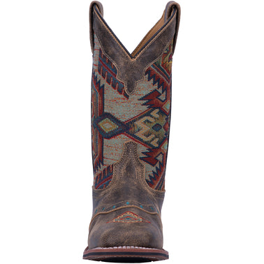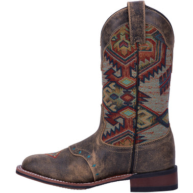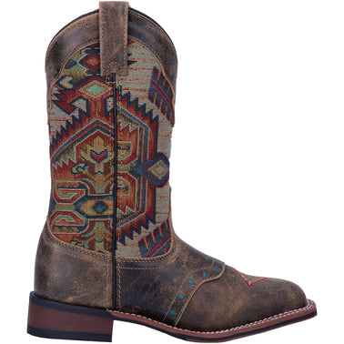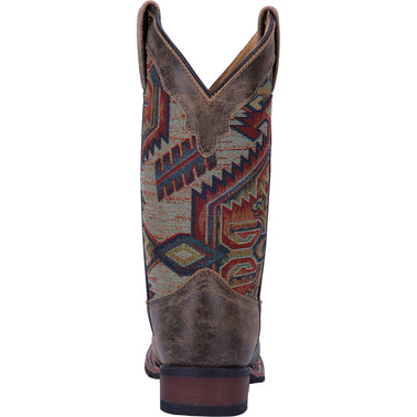 The Scout Women's Leather Boot from Laredo has an Aztec-inspired design both on the fabric shaft and the foot. This boot offers a distressed look and a square toe.