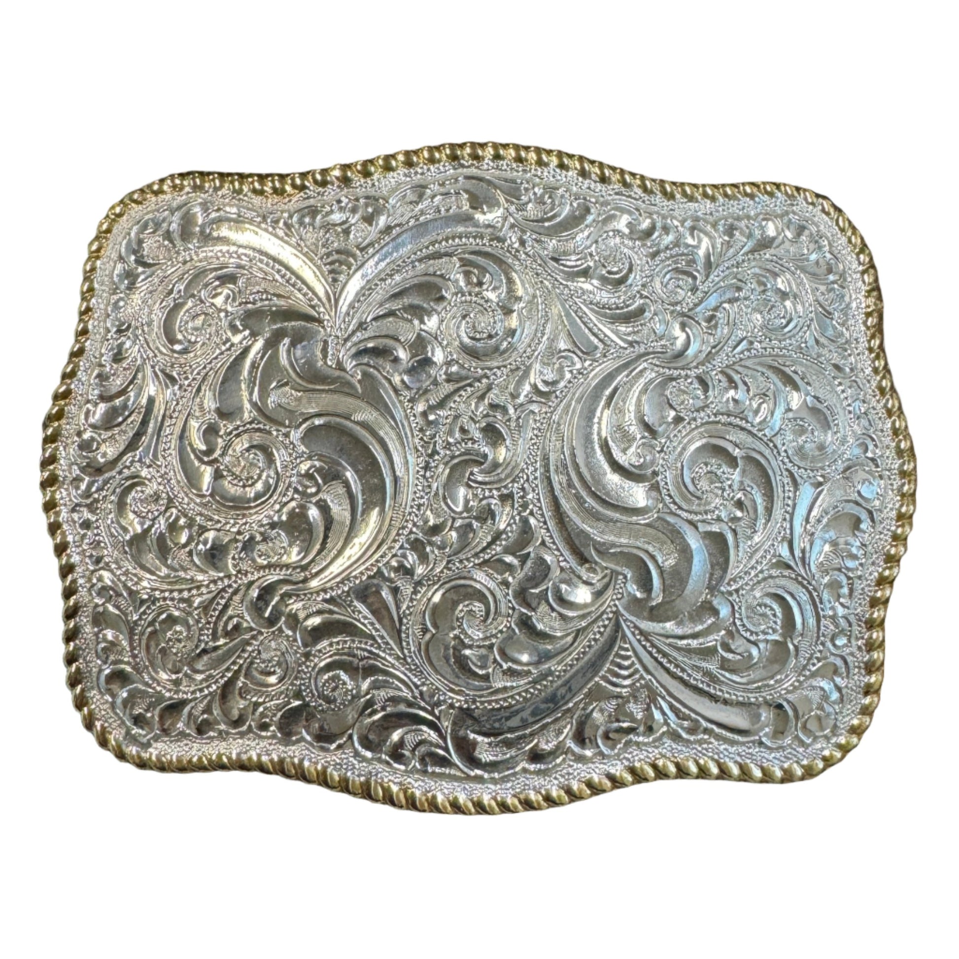 Crumrine hand engraved buckle in shiny silver and bronze finish with beautiful floral engraving. Timeless buckle that will never go out of style.
