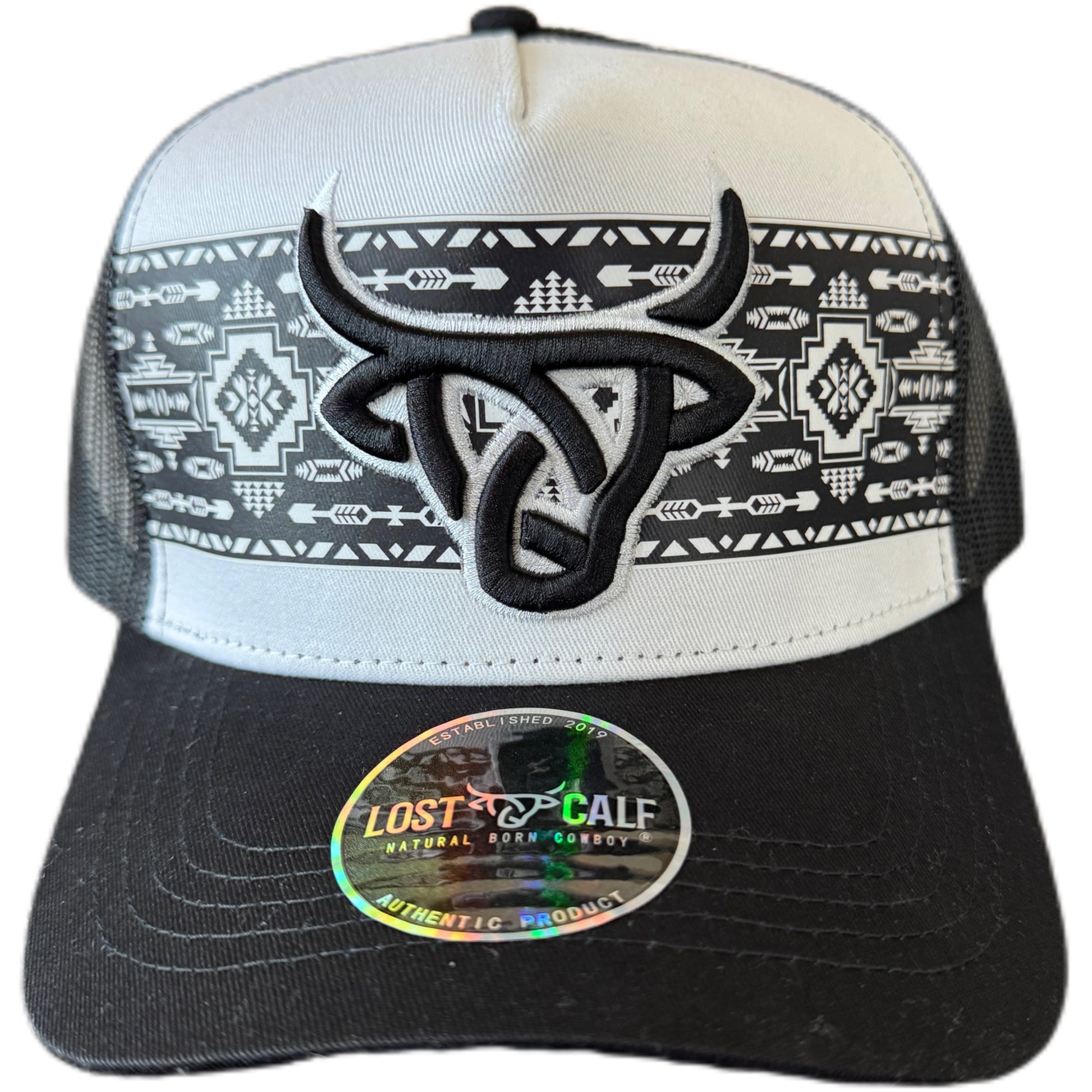 Baseball cap with Lost Calf logo embroidered on front, Lost Calf stitched on left side. Snap back - one size fits all.