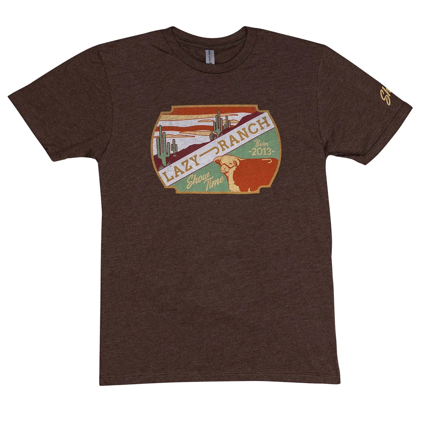 Make a statement with the Lazy J Ranch Desert Showtime Short Sleeve T-Shirt. Featuring a bold Showtime graphic on the chest, this brown cotton blend tee combines comfort and style effortlessly. Designed to run smaller, we recommend sizing up for a more relaxed fit. Perfect for casual outings or a day at the ranch.