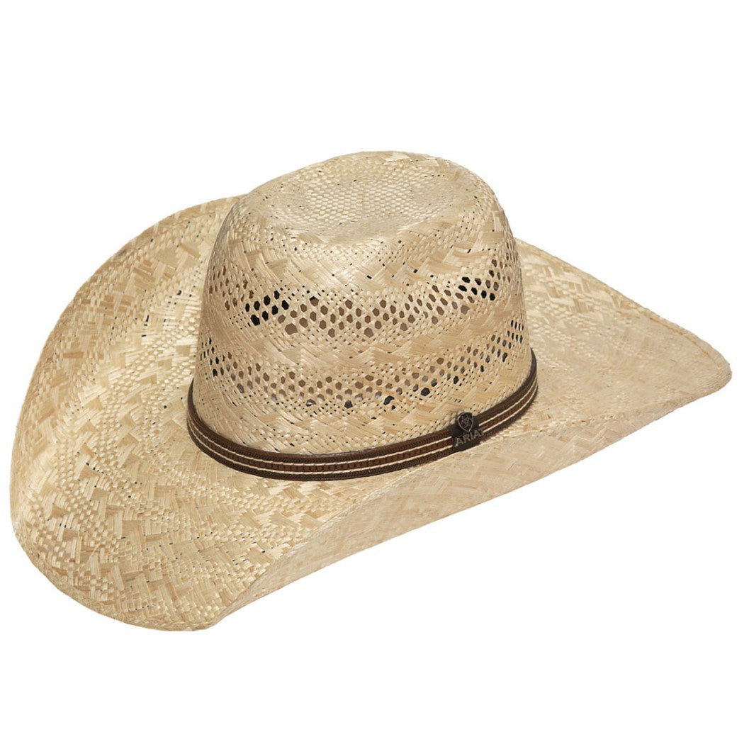 The 10X Sisal Punchy hat from Ariat features a leather sweatband and a fancy hatband.