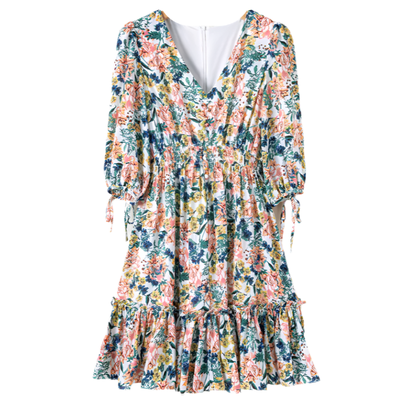 Embrace elegance with our Sky-Blue Floral Dress featuring delicate ruffled accents and a flattering high waist design. The charming V-neck adds a touch of sophistication, while the three-quarter sleeves offer a stylish and comfortable fit. Crafted with a shirred waist detail, this dress cinches at the waist for a feminine silhouette that exudes grace and charm.