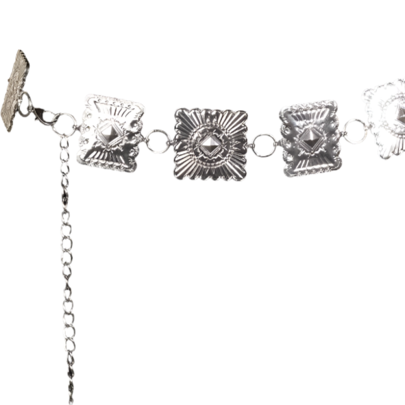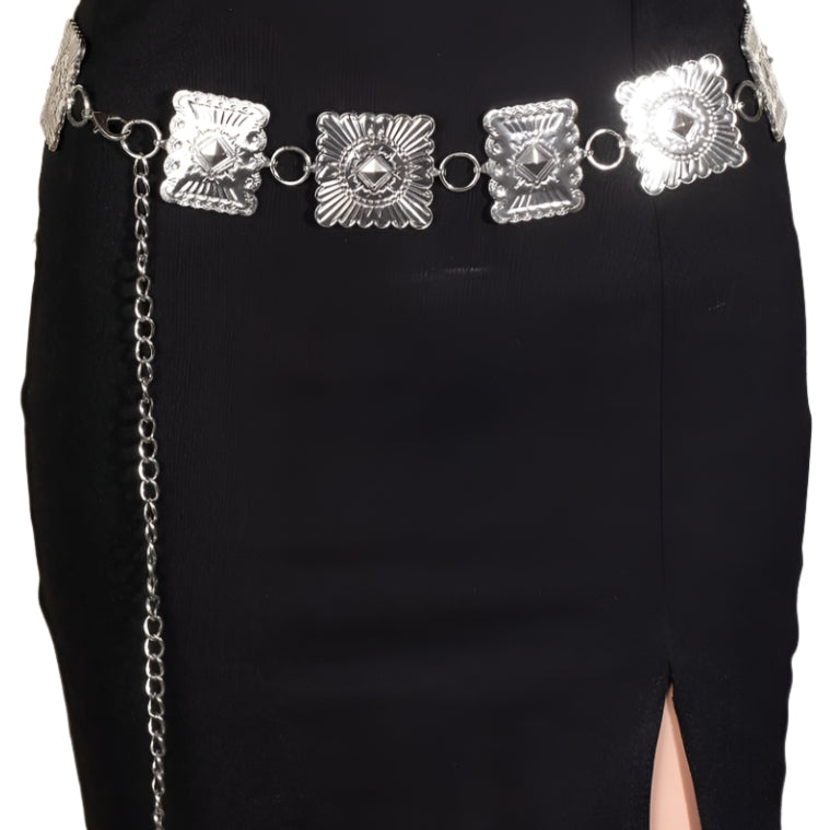 This chain belt brings a unique intricate metallic square concho style. Elevate your ensemble with this chic, timeless chain belt.