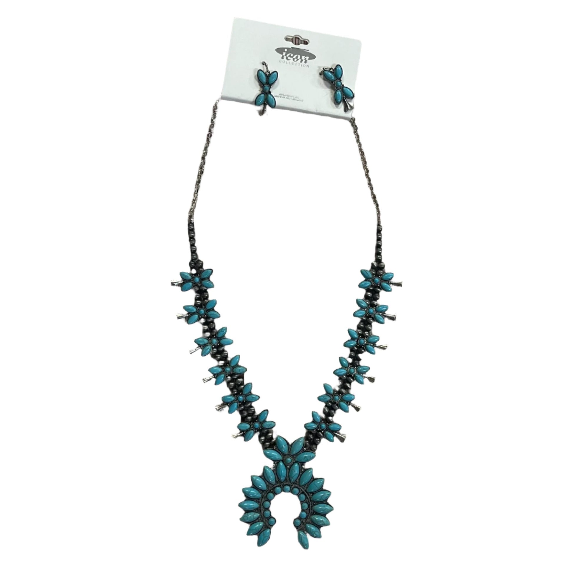 Beautiful southwestern inspired semi-precious stone squash blossom statement necklace with matching set earrings.
