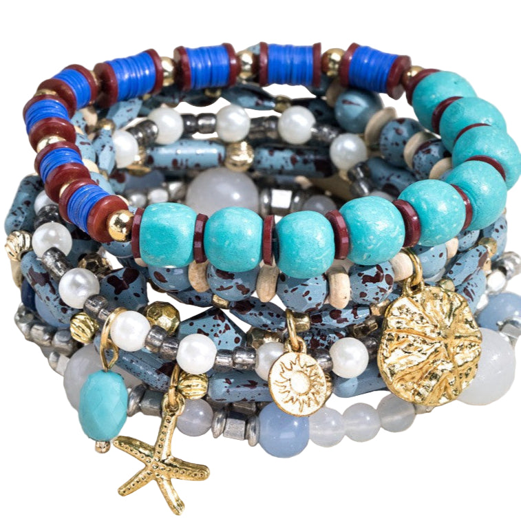 Dazzling bohemian multi strand wood, metal, glass and a natural stone multi beaded stretch bracelet set