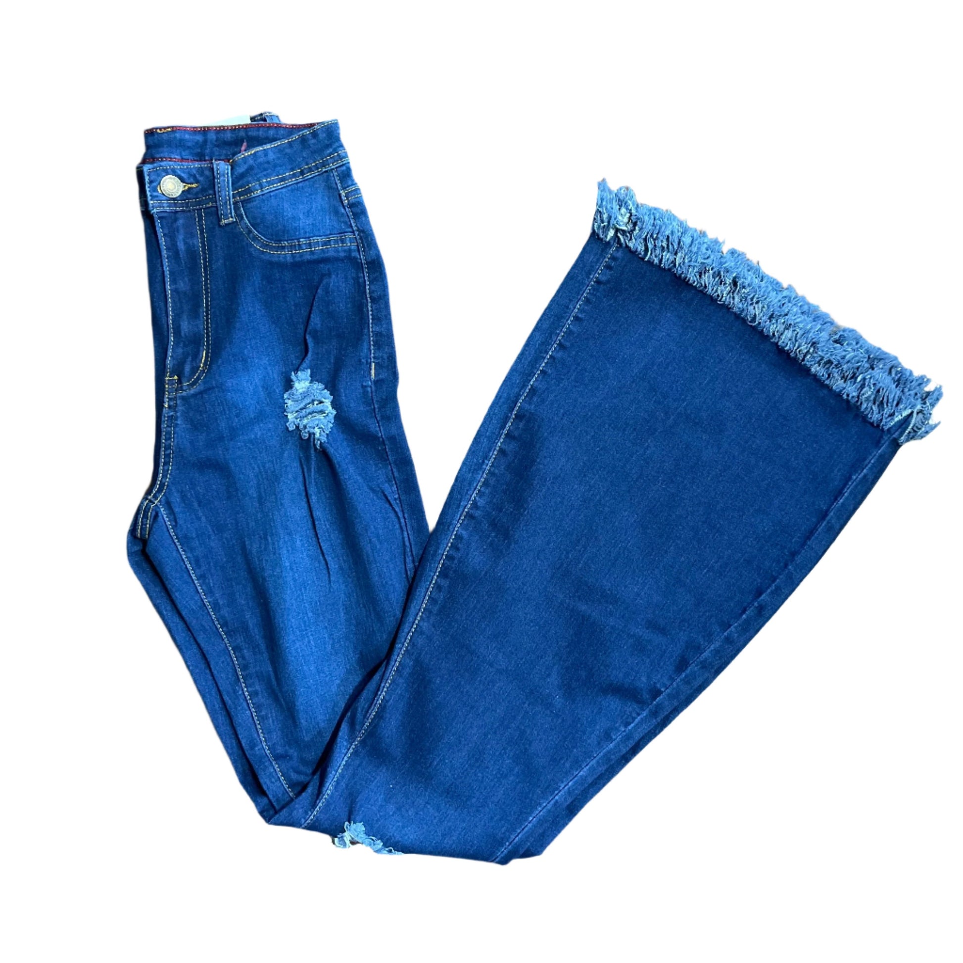 The stretchy super flare jeans features a high waist, zip fly, faux front pockets, functional back pockets, and belt loops.