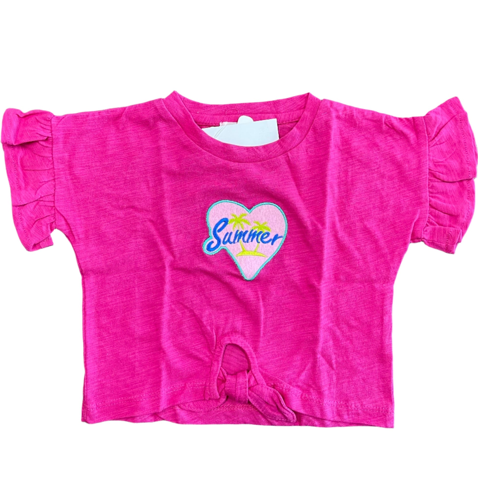 The Summer tee in fuchsia features a knot tie with ruffles on the sleeves.