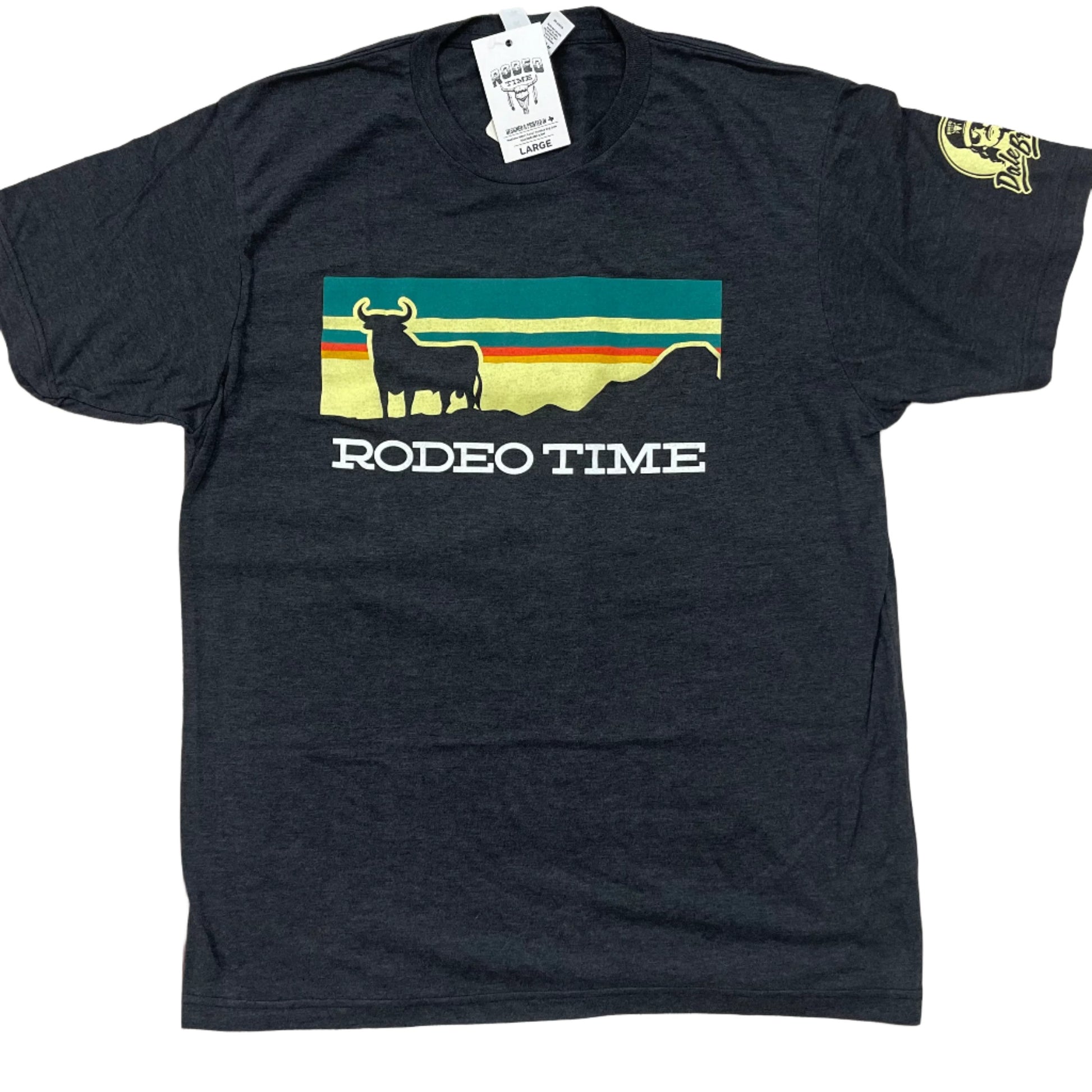 The Sunset Rodeo Time T-shirt from Dale Brisby features a Rodeo Time graphic in yellow and teal on a tri-black t-shirt.