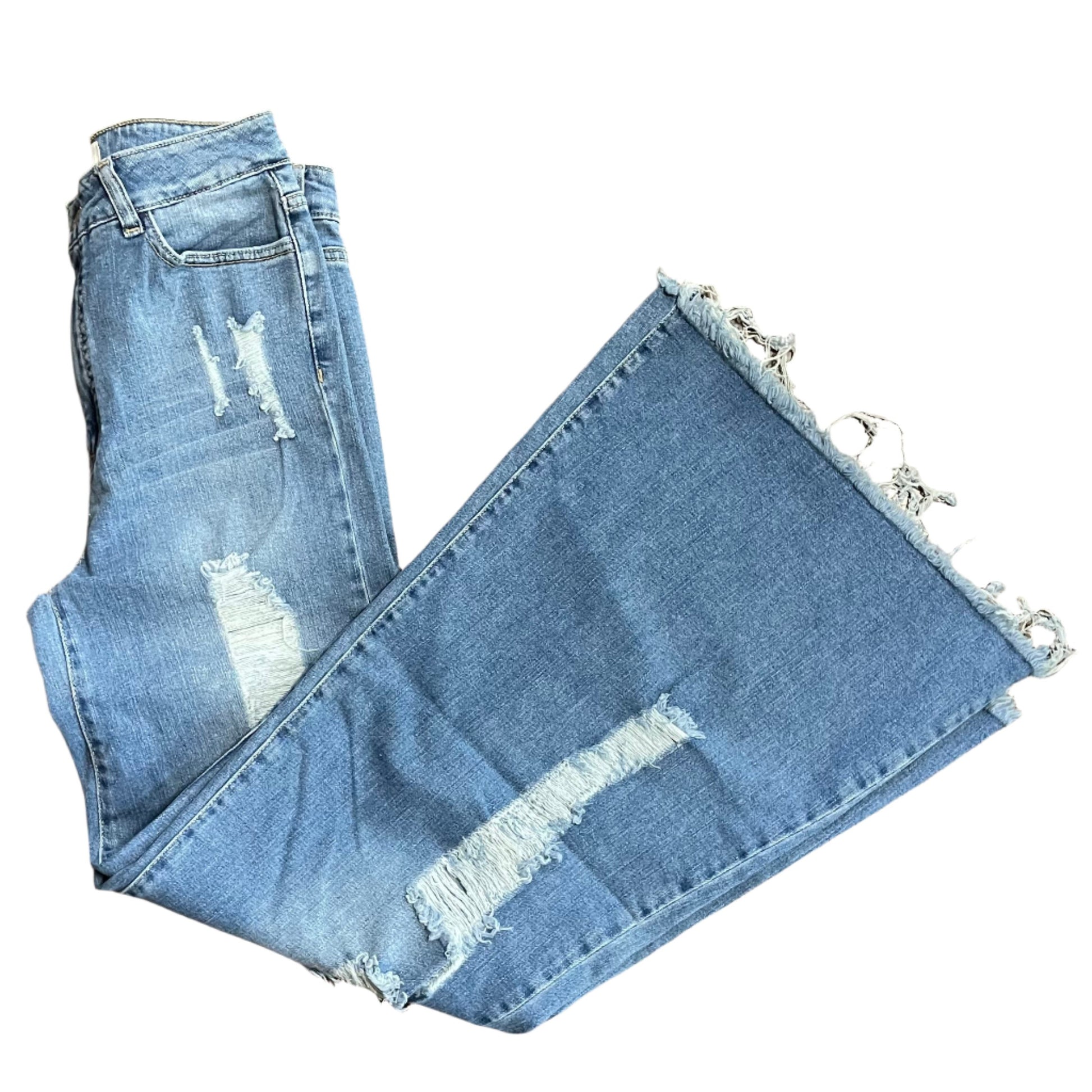 The super flare jeans in light wash are high rise, with distressed legs and hem.