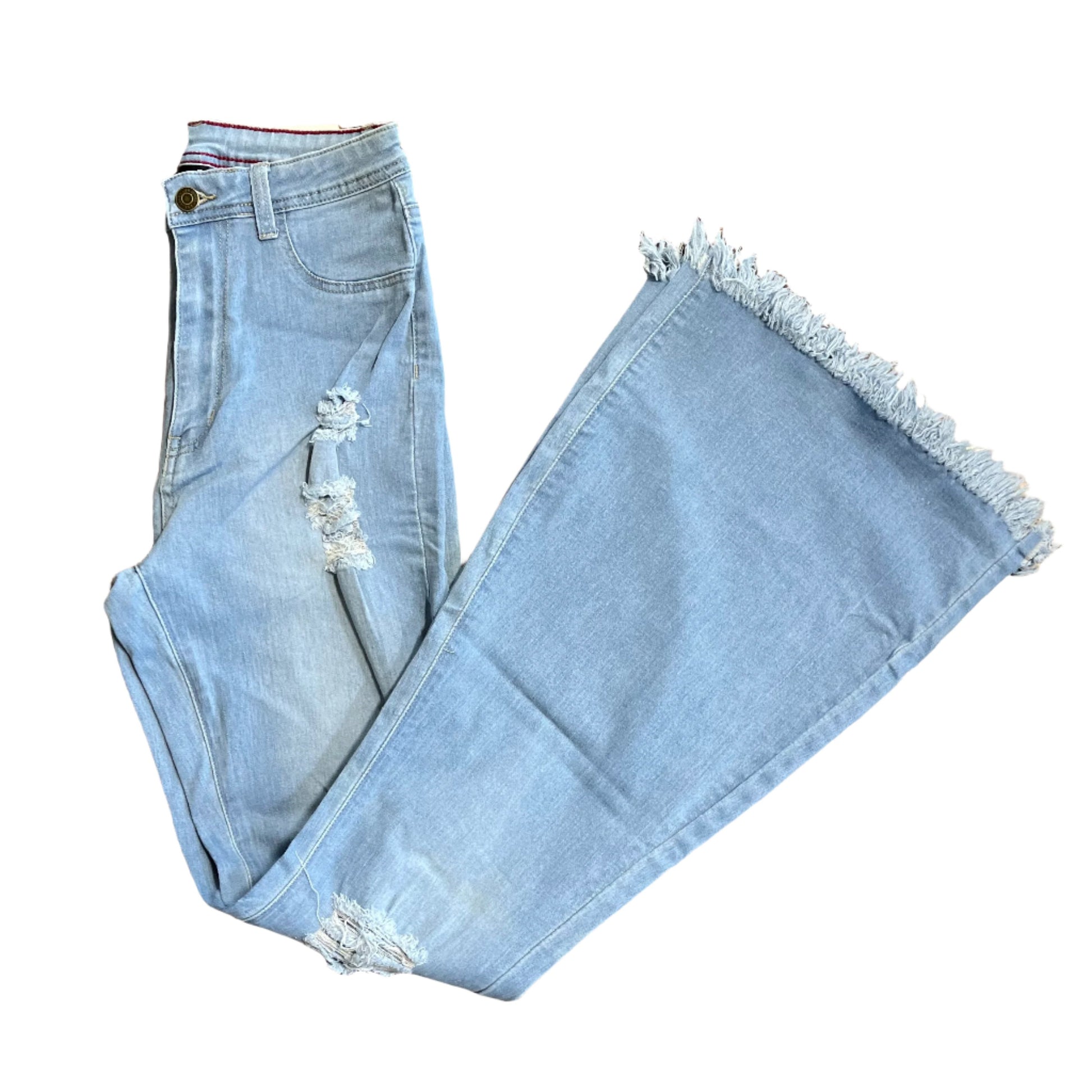 The stretchy super flare jeans in light wash feature a high waist, zip fly, faux front pockets, functional back pockets, and belt loops.