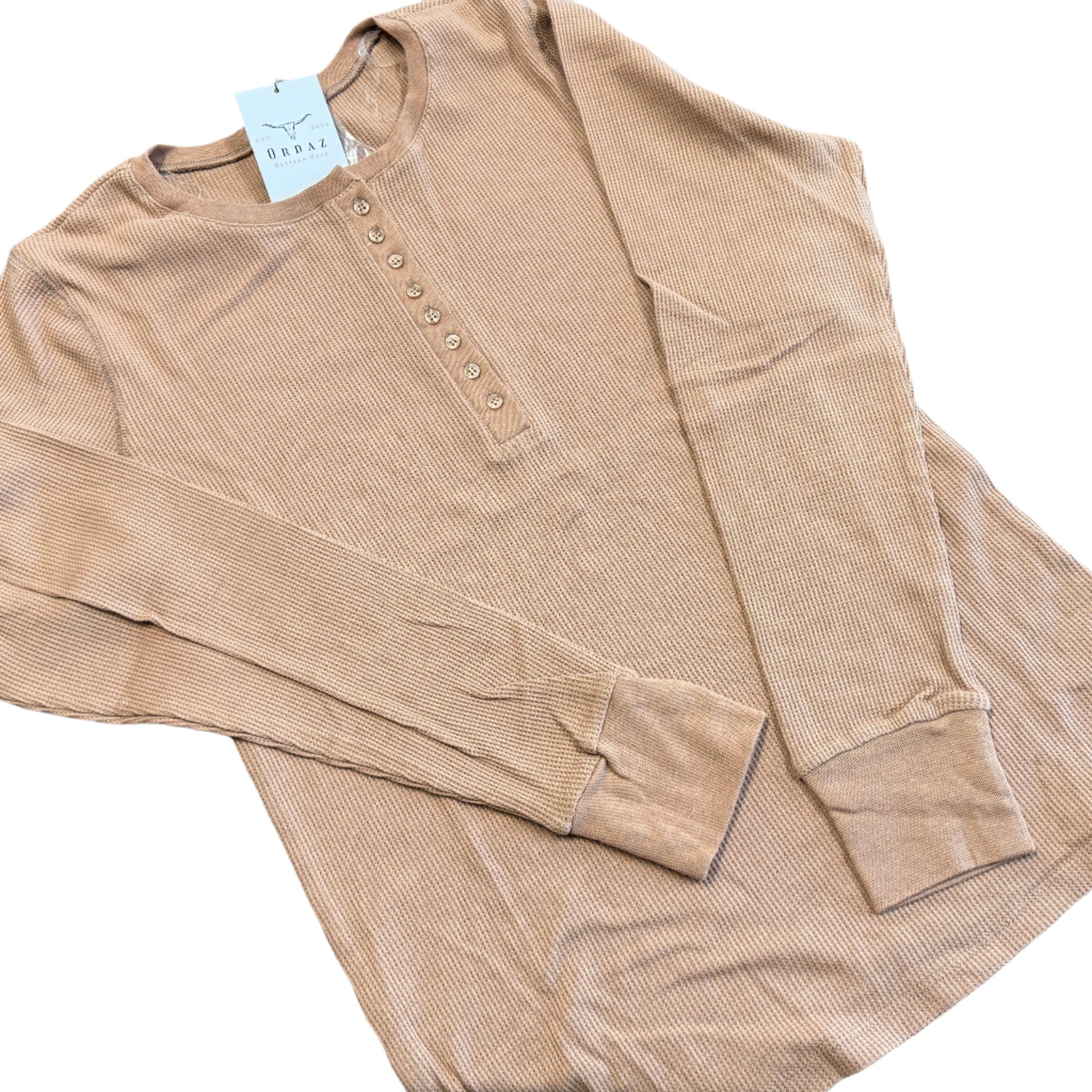 Long sleeve crew neck, thermal knit top with button detail.
