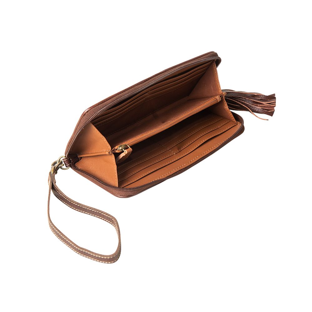 This stylish hair-on hide wallet features special hand-tooled turquoise leather accents. The interior features spacious sections, including a zippered pocket. Wrap-around zippered closure keeps everything snug and secure. This wallet will surely become your favorite with its striking design. A great addition to any collection!