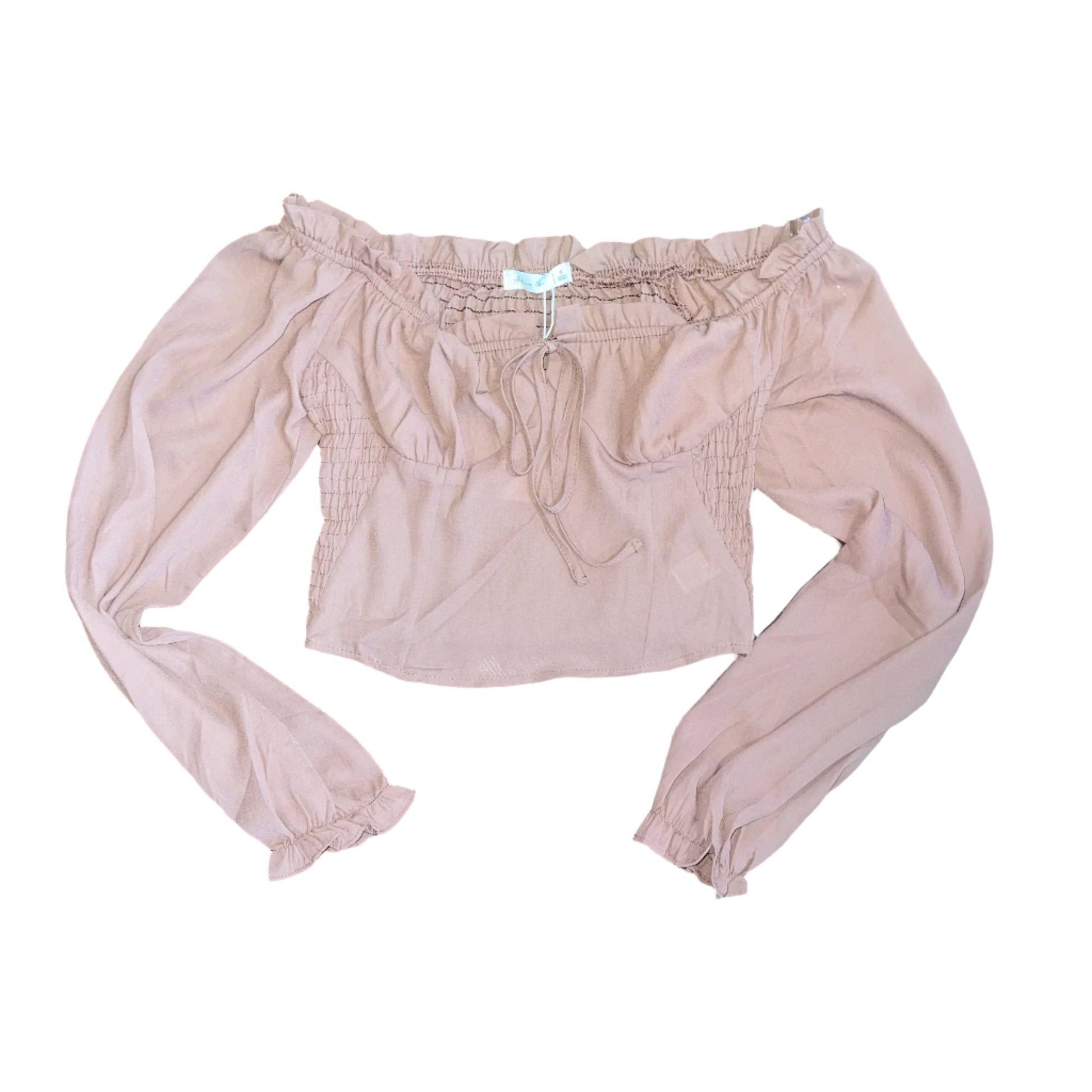 The Off the Shoulder Top in truffle features long sleeves and a ruffle with back smocking detail.
